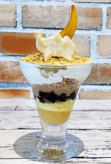 万博会場でも大人気だった、ヨルダン館のサンドアートをイメージしました。下から、柿のゼリー、カスタードクリーム、ミルクきな粉ゼリー、黒蜜ゼリー、クラッシュアーモンド、バニラアイス、生クリーム、きな粉。見た目もかわいい、大人の和風パフェ。柿の三日月とらくだのオブジェが心をくすぐります。柿ときな粉は鳥取県産です。