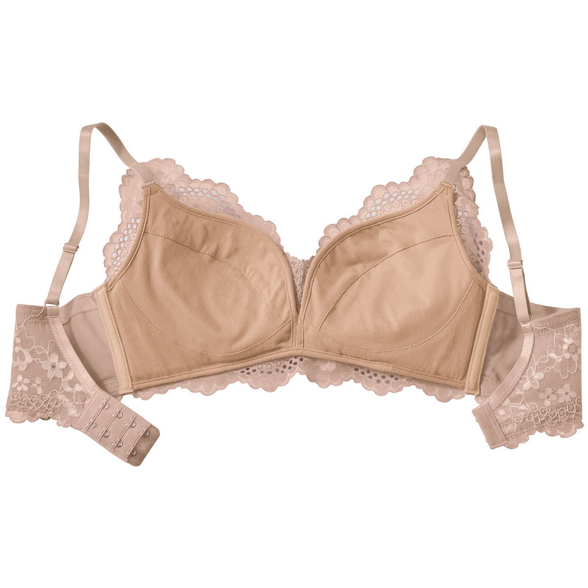 ノンワイヤーなのにトップを高い位置でキープ!カップ台もウレタン仕様でフィットして、バストを持ち上げデコルテをふっくら!カップレースは本体とは縫い付けない仕様でカップ上辺の段差をぴたっとカバーします。後ろホックは2段掛け4列なので、ぴったりからゆったりまで着用感も選べます。レースにはプリントをして華やかさをプラス!アウター対応用として、カラーにベージュも用意しました♪