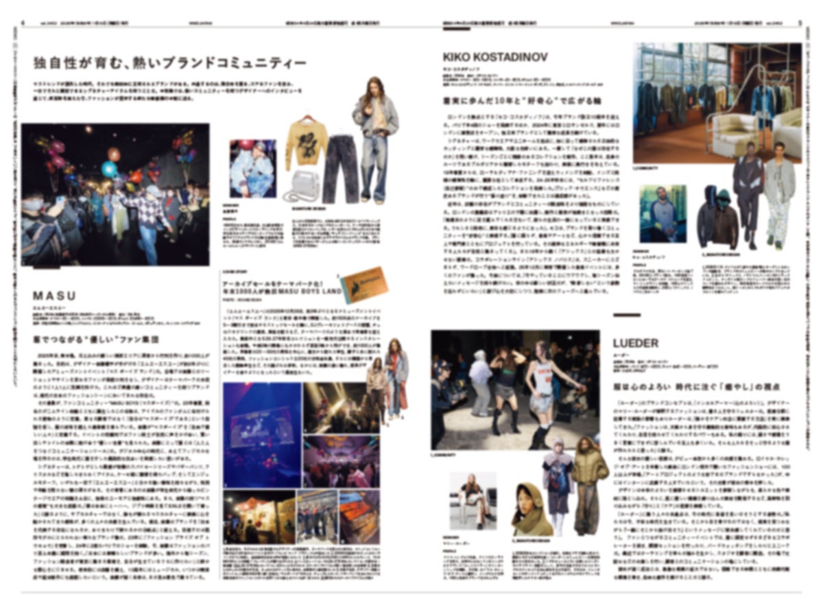 表紙に登場したのは、まさに熱狂的なファンコミュニティーを築く「エムエーエスユー(MASU)」です。そのほかにもロンドンの「キコ コスタディノフ(KIKO KOSTADINOV)」や「ルーダー(LUEDER)」など、さまざまなブランドが登場します。