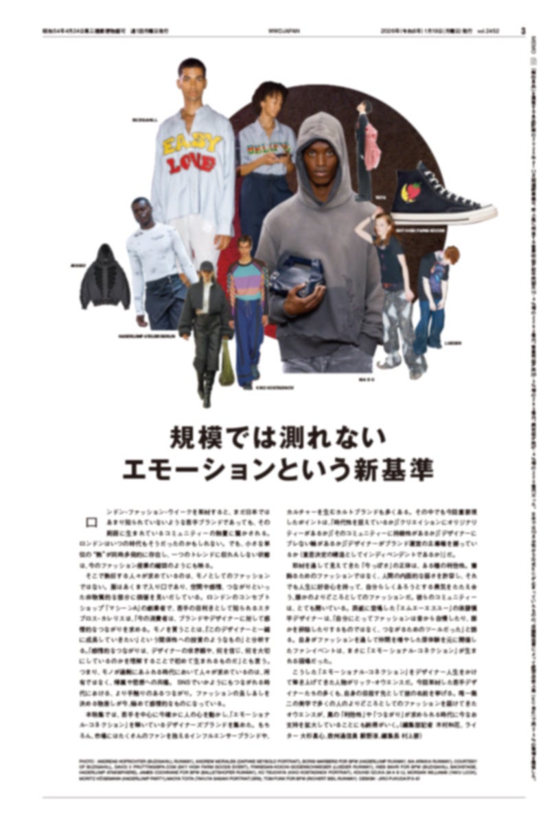 「WWDJAPAN」1月19日発売号では、「熱狂を生む世界のデザイナーズブランド」を特集します。世界各国のファッション・ウイークを取材する記者たちが、「いま、面白い」と感じるブランドを掘り下げました。キーワードは、「エモーショナル・コネクション」。売り上げ規模や知名度では測れない、感情的で本質的なファンコミュニティーを築き上げているブランドたちに光を当てました。