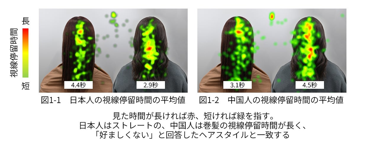 その結果、日本人、中国人とも「好ましくない」と選択した毛髪の視線停留時間が長く、日本人は巻髪を、中国人はストレートのヘアスタイルを好む嗜好性の違いが明らかになりました。(図1)