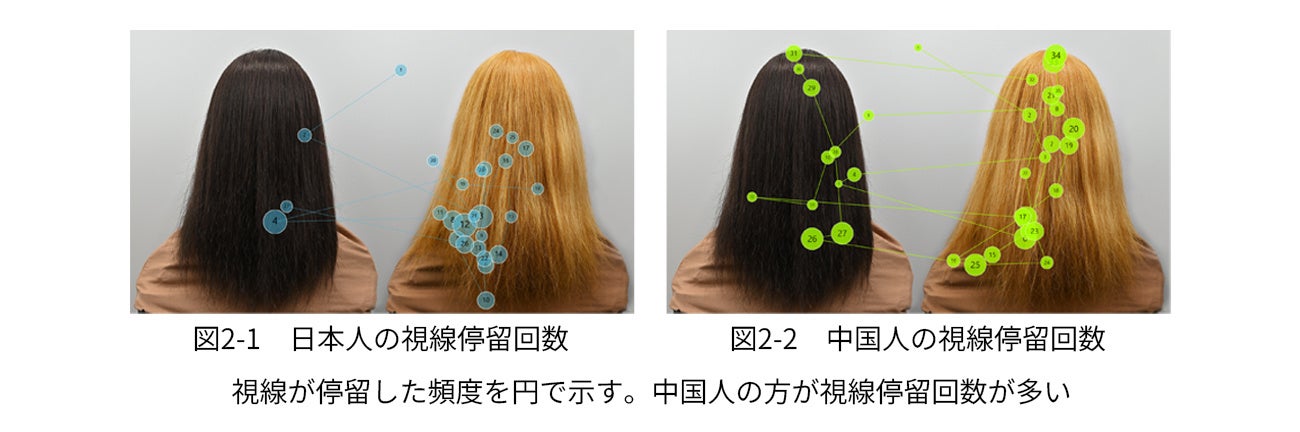 また、日本人は視線をあまり動かさず、毛髪全体を漠然と観察する傾向が見られたのに対し、中国人は毛髪を広範囲かつ頻繁に視線を止めながら、注意深く観察する傾向が見られました。(表1・図2)