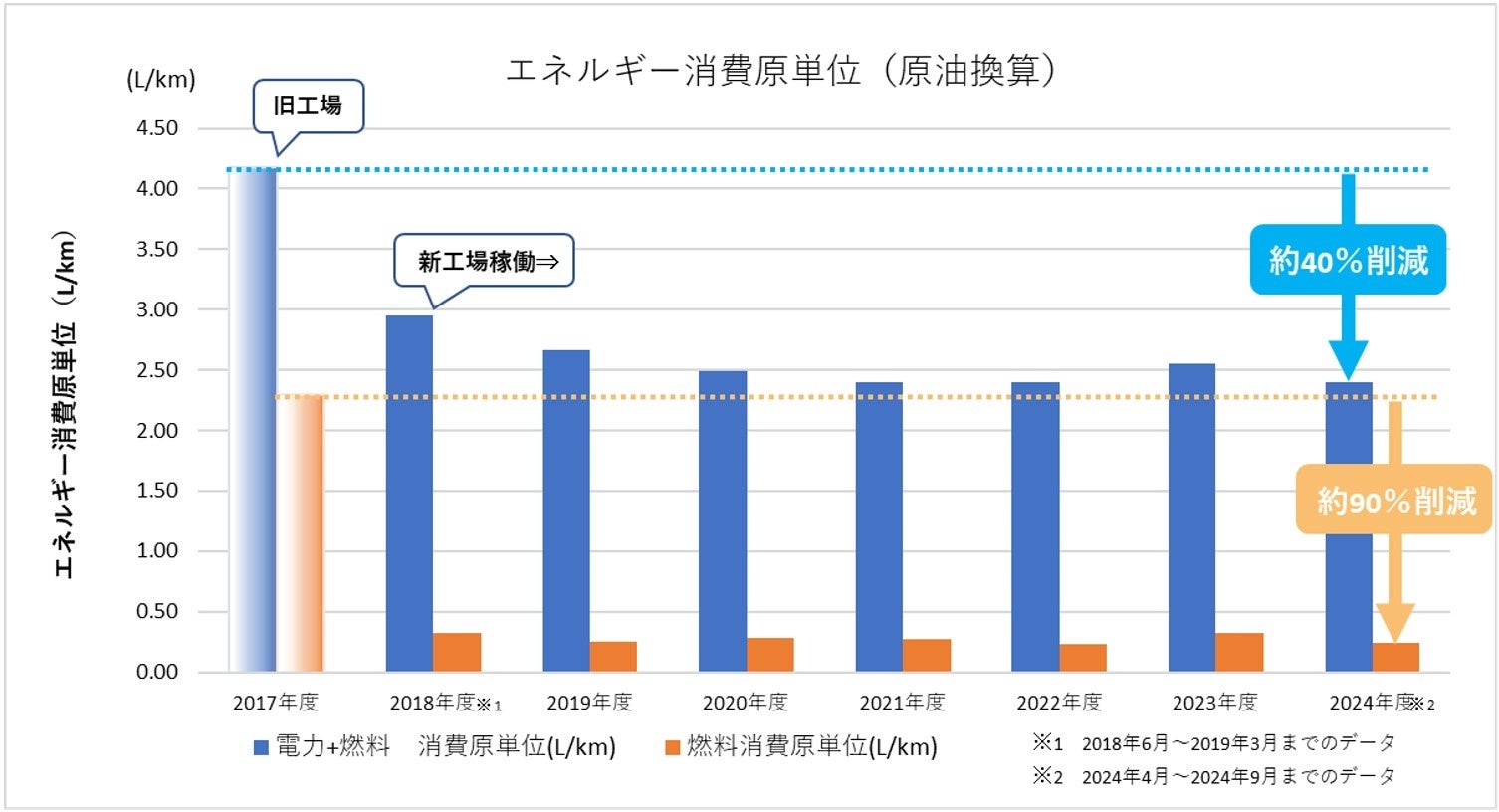 翌年の2018年にはエフピコグループの環境方針に基づき、空調エネルギーを無駄なく使用するシステム及び印刷室内の乾燥設備で揮発されたVOCを燃焼処理する際に出る熱エネルギーを最大限利用するための設備・システムを導入し、環境負荷を最小限にする油性グラビア印刷工場を設立しました。2017年の旧工場に比較してエネルギー消費原単位を大幅な削減を継続しております。