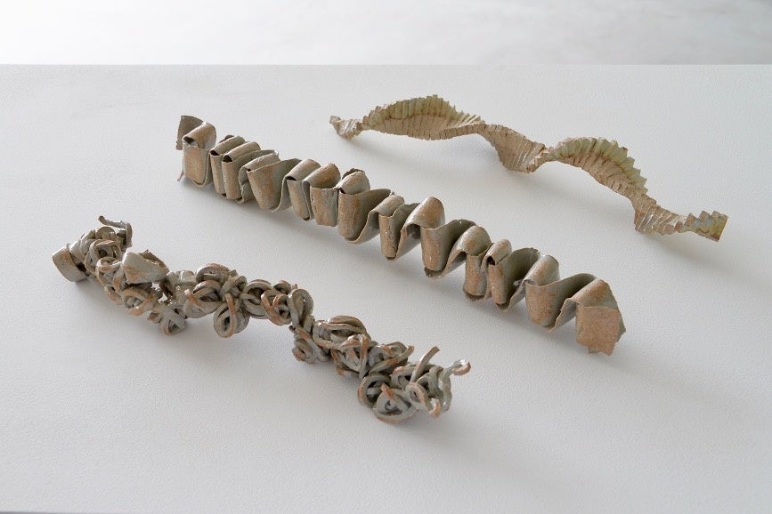 昨年の初秋に和菓子の歴史やつくられる工程を教えていただくところから始まり、器の制作は秋から冬、そして立春のころまで続きました。制作を通して、改めて陶土の扱いの難しさを実感しました。この課題では素材への理解を深めるとともに、想像力を養い何度も思考を重ね作品をプラッシュアップしてきました。本展では学生一人一人が思いや気持ちを込めて制作した「うつわ」を展示しております。