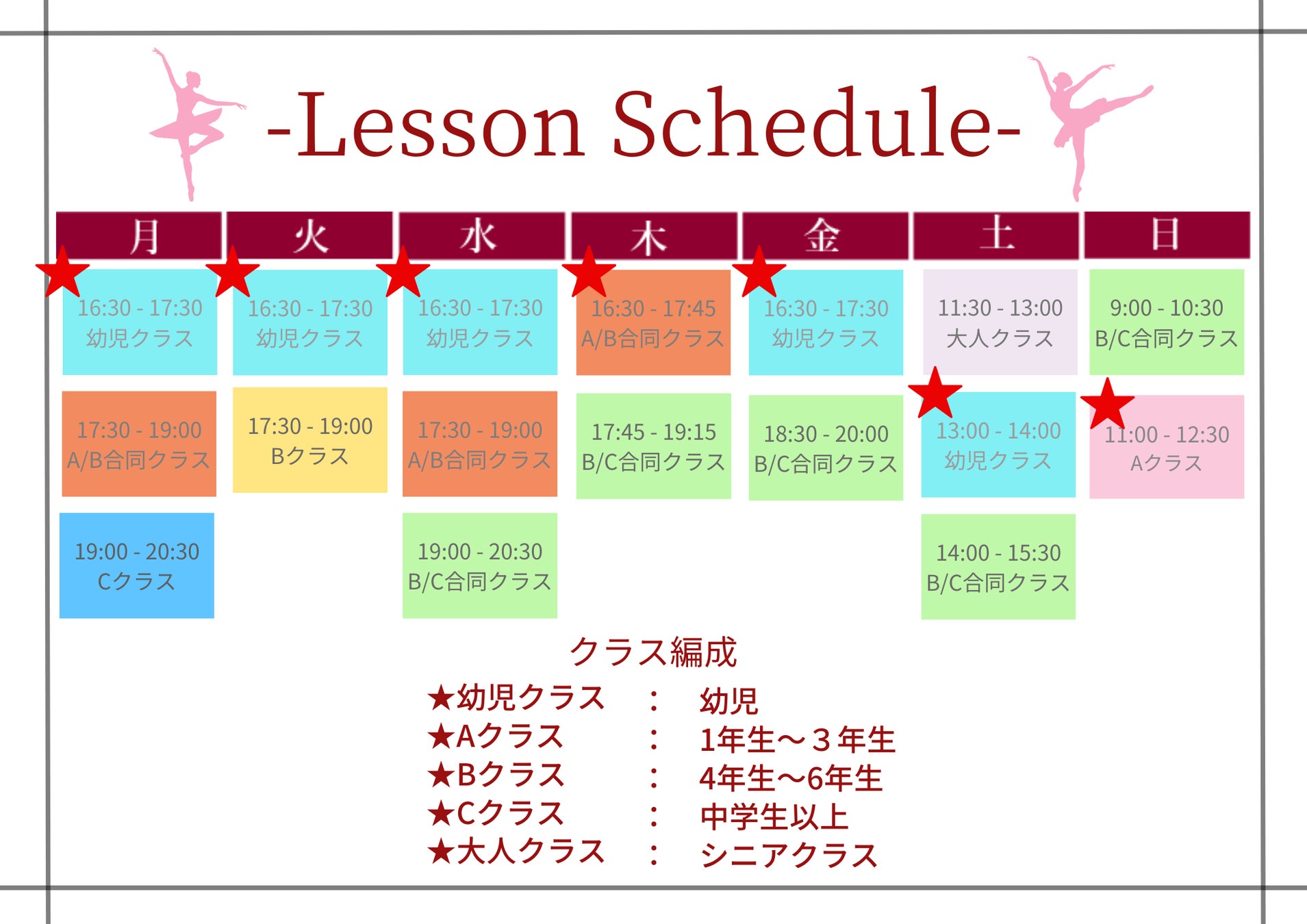 画面下はレッスンスケジュールです。各コマ左上の赤い★マークがついているところが体験レッスンの枠となっております。もちろんこの時間以外のレッスンの体験受講も可能です。