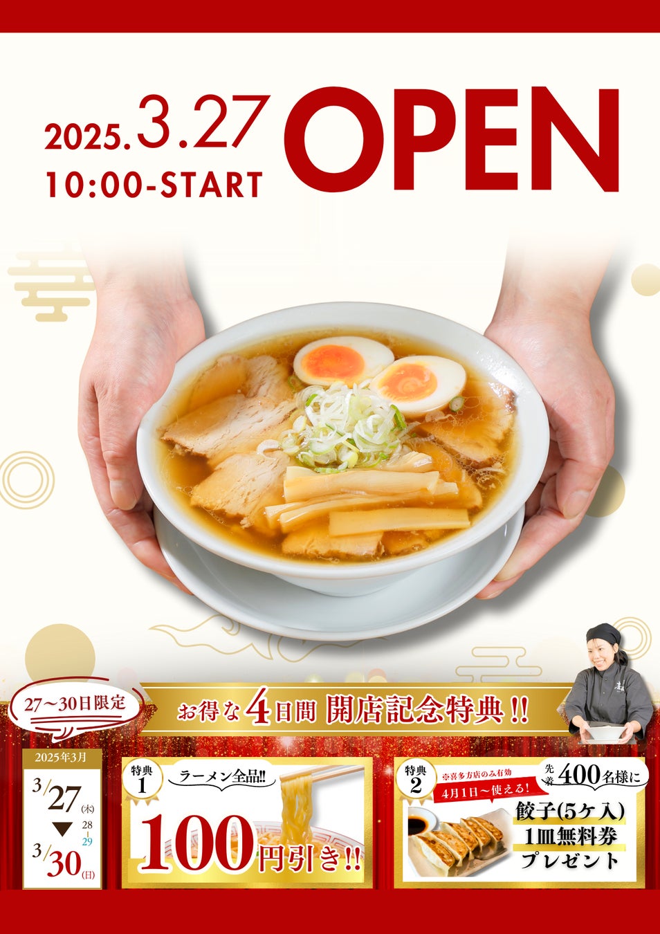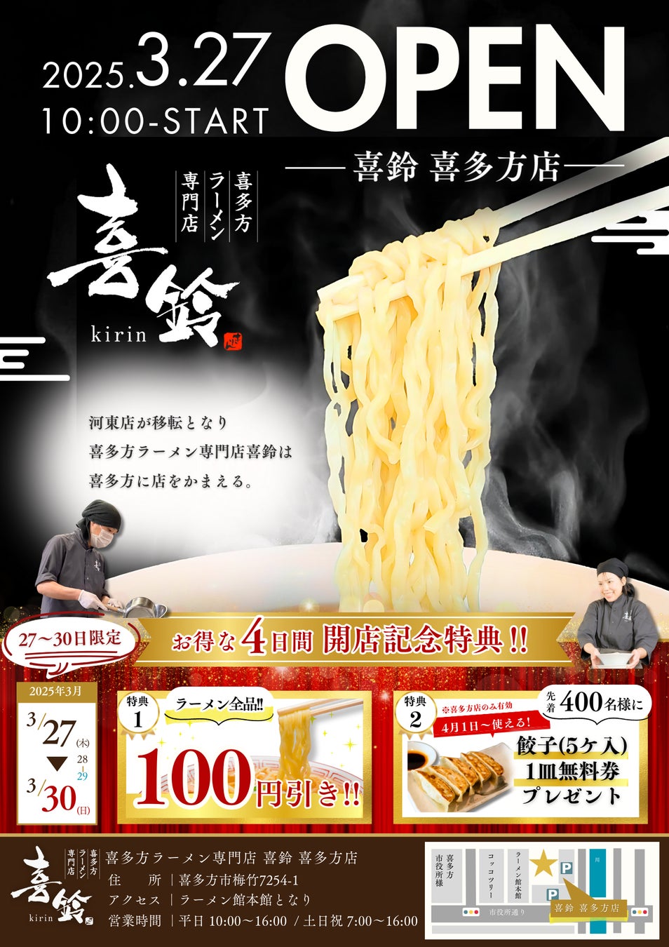 2025年3月27日(木)、株式会社河京エンタテインメント(福島県喜多方市、取締役社長:土屋充孝)は福島県喜多方市に「喜多方ラーメン専門店喜鈴 喜多方店」をオープンいたします。