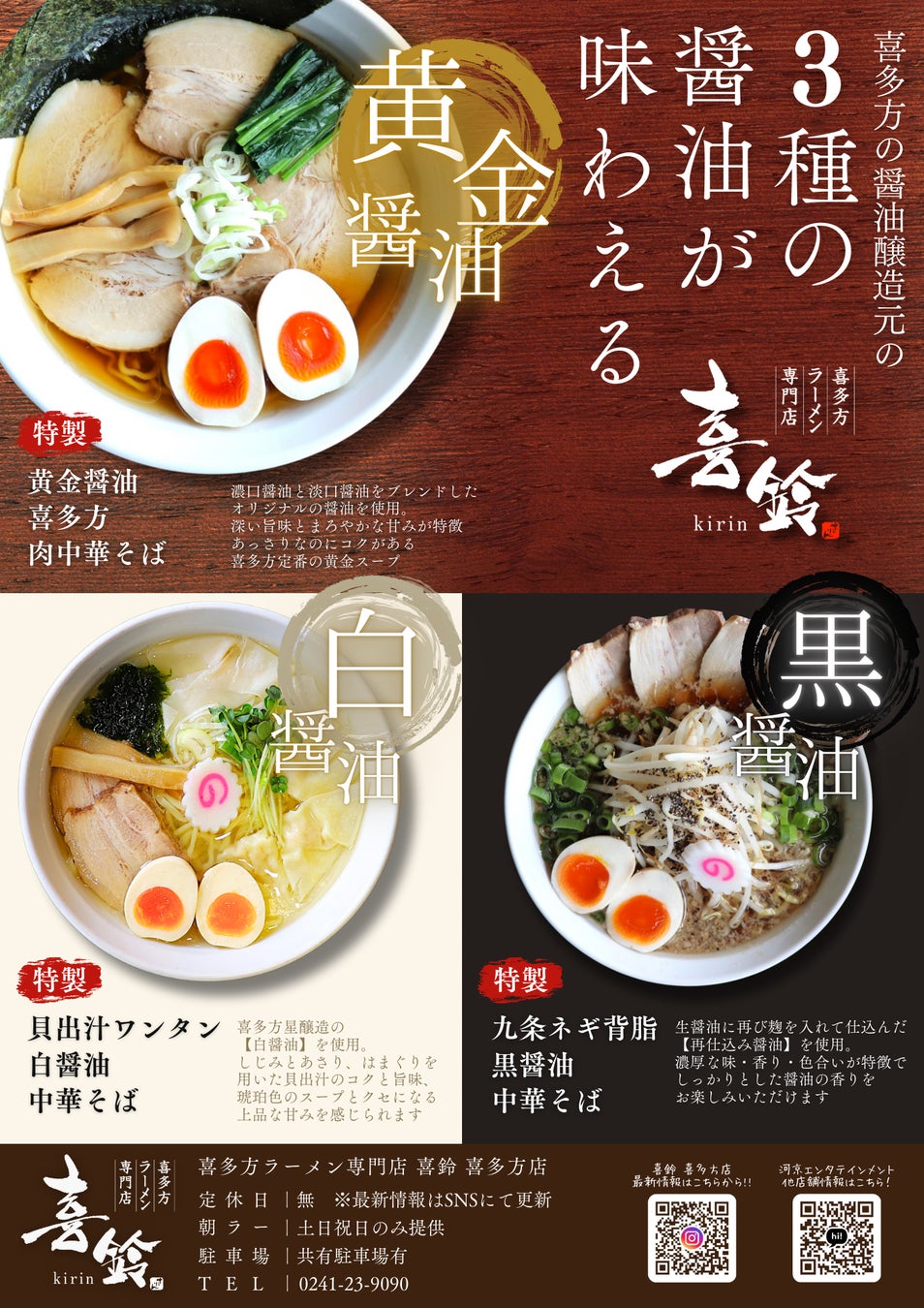 【NEW OPEN】3/27「喜多方ラーメン専門店喜鈴」喜多方市に移転OPEN‼お土産・カフェ・ラーメン店の3店舗が集合!河京エンタテインメント一大拠点誕生⁉喜多方醤油醸造元の3種の醤油が味わえます。