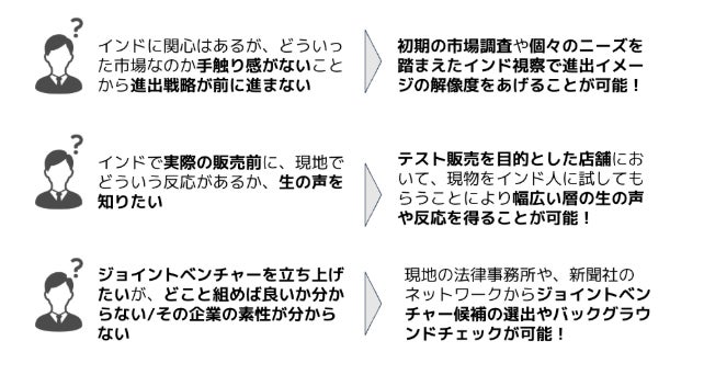 インド市場への進出をご検討中の企業様に向け他プラットフォーム「Do Lab India」では検討段階に応じた多様な支援メニューをご用意しております。初期検討段階の企業様から、過去に挑戦されたものの進展が難しかった企業様まで、それぞれの状況に応じた最適なサポートをご提供いたします。