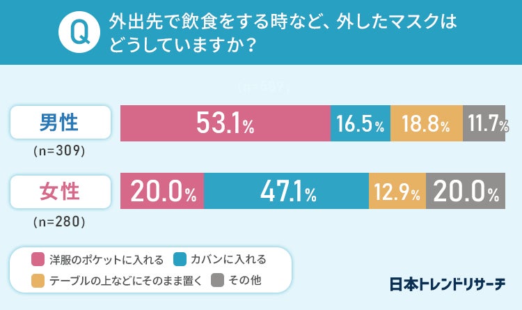 【マスクケースを使わない派は…】外出先で外したマスク、男性は「洋服のポケットに入れる」、女性は「カバンに入れる」が多数派
