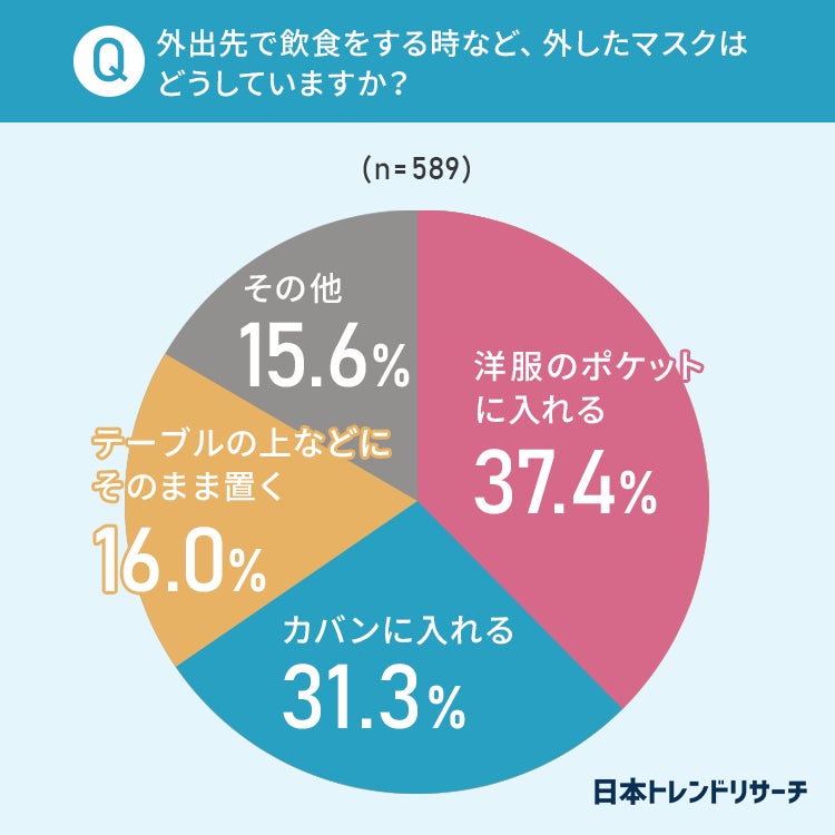 マスクケースを「持ち歩くこともある」「持ち歩かない」と回答した589名の方に、外出先で飲食をする時などに外したマスクはどうしているか聞きました。