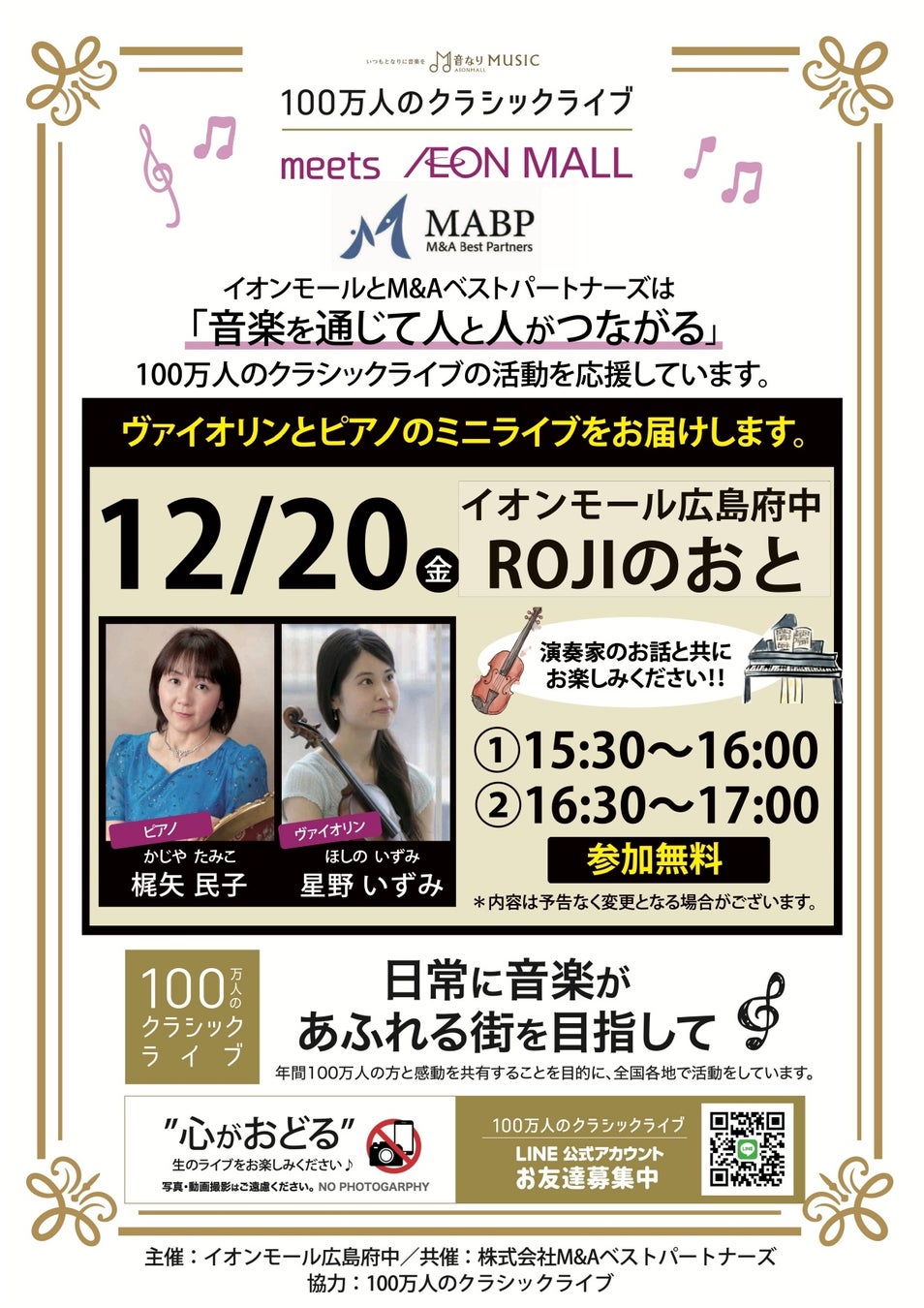 製造、建設、不動産、医療・ヘルスケア、物流、ITに特化したM&A仲介を⾏う株式会社M&Aベストパートナーズ(本社:東京都千代田区、代表取締役社長:齋藤 達雄 以下M&Aベストパートナーズ)は、イオンモール広島府中にて、クラシックライブ(協力:一般財団法人100万人のクラシックライブ 以下100万人のクラシックライブ)を、12月20日(金)に開催することをお知らせいたします。