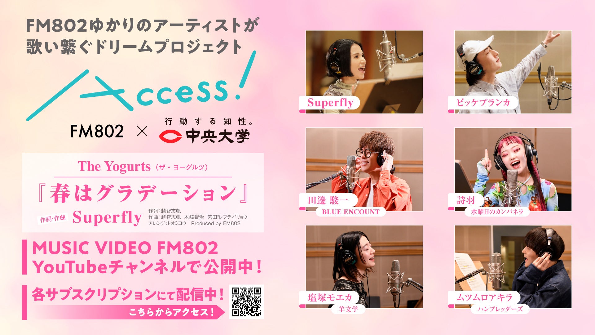 また、5月3日(水・祝)夜9時~の『ROCK KIDS 802ーOCHIKEN Goes ON!!-』では、番組全編を通して“FM802×中央大学 ACCESS!“を大特集します!Superflyへのインタビューを始め、「春はグラデーション」を歌うスペシャルユニット:The Yogurts(ザ・ヨーグルツ)のメンバーでもある塩塚モエカ(羊文学)、ムツムロアキラ(ハンブレッダーズ)も登場!こちらもお楽しみに。
