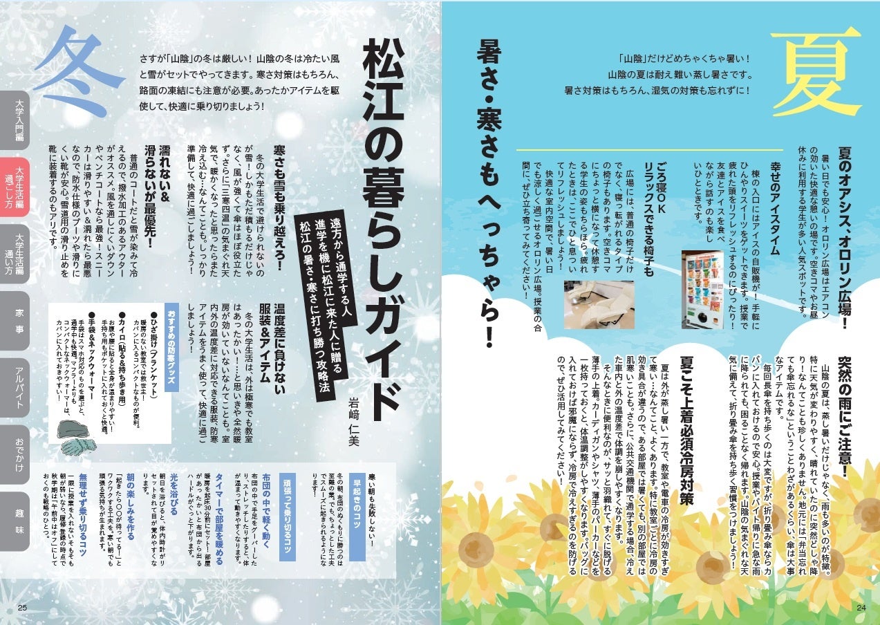 内容は学生による「ウラ大学案内」を標榜しており、松江キャンパスの学生たちが入学時の困りごとへの解決法や休日の過ごし方など実体験に基づくアドバイスが記されています。