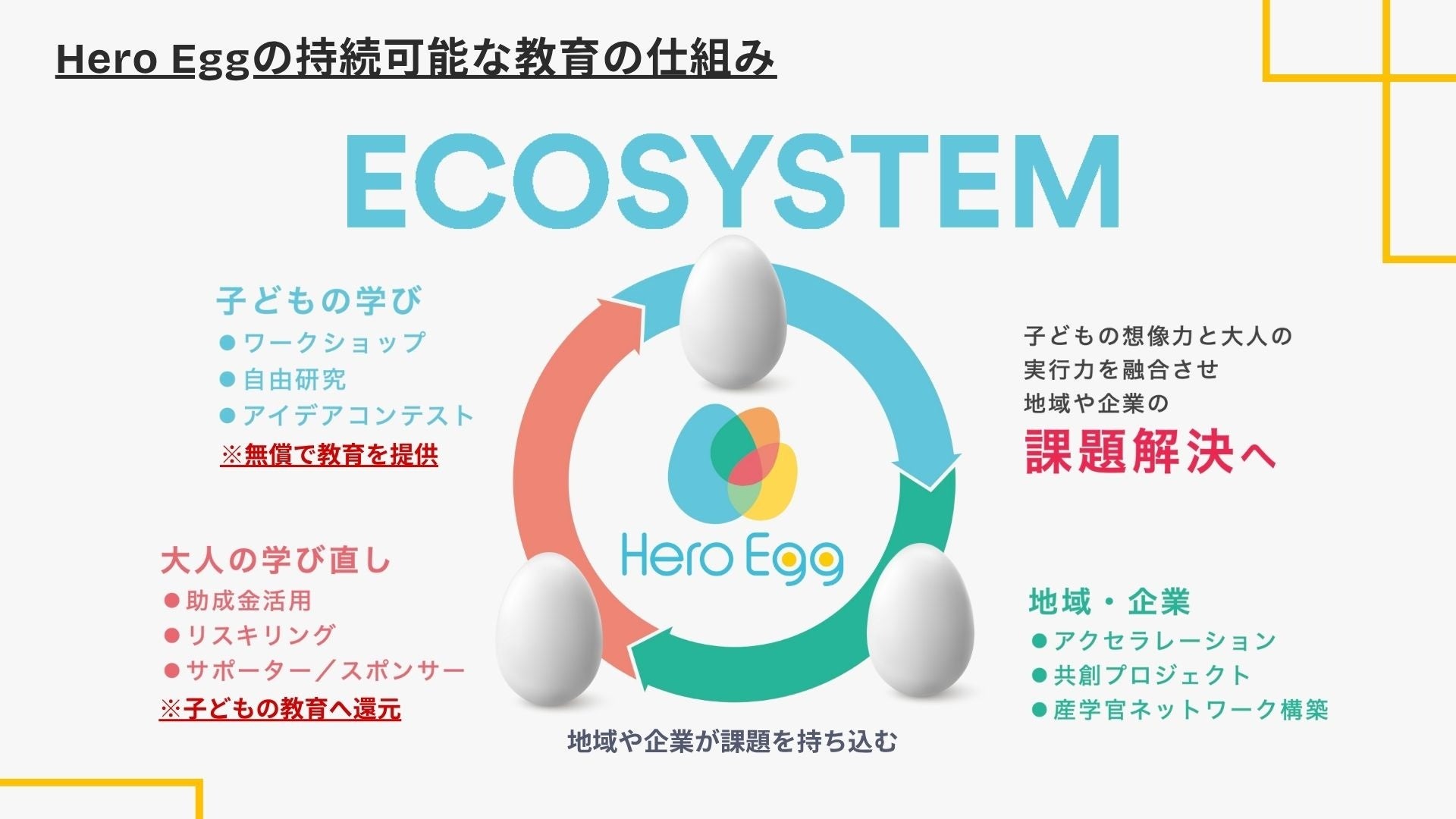 サポータープランを通じて得た大人の学びの成果が、子どもたちの“原体験”の創出へと循環していく。さらに、子どもたちがHero Eggで生み出したアイデアやプロダクトを、サポーターである大人たちの実行力と結びつけ、地域や企業の課題解決へつなげていく——そんな循環型の学びのエコシステムを目指しています。