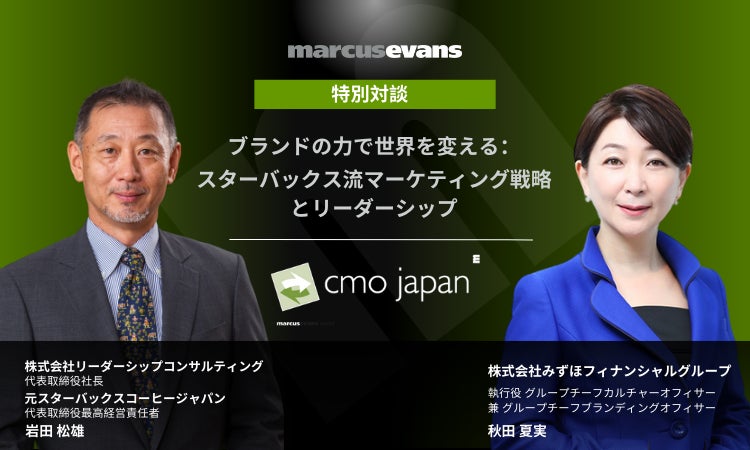 マーカス・エバンズ・イベント・ジャパン・リミテッド (本社: 英国/ 日本支社代表: 雪下 大輔、以下「マーカスエバンズ」) が主催するマーケティング部門向けビジネスサミット『CMO Japan Summit 2024』にて元スターバックスコーヒージャパンの岩田 松雄氏とみずほフィナンシャルグループの秋田 夏実氏の特別対談が決定しました。