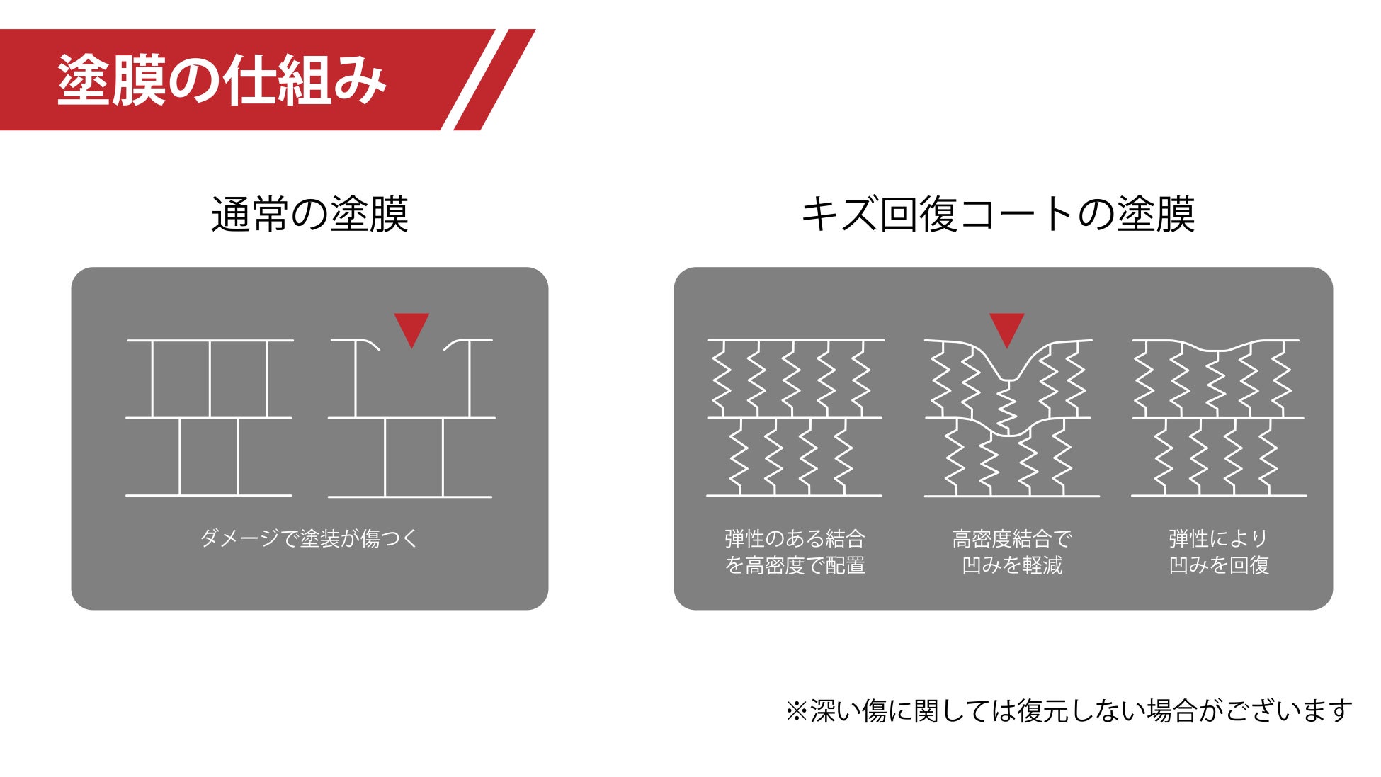擦り傷がつきにくくなるのはもちろん、細かい傷なら弾力のあるコーティングが高密度結合で復元させます。