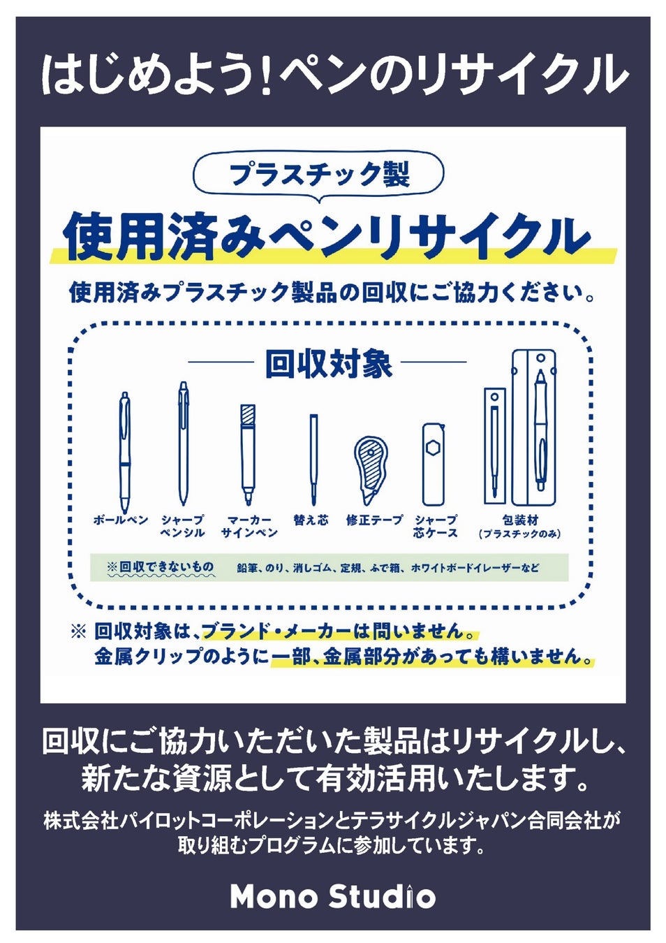 このリサイクル活動は、株式会社パイロットコーポレーション(東京都中央区、代表取締役社長:伊藤秀、以下「パイロット」)とテラサイクルジャパン合同会社(神奈川県横浜市、アジア太平洋総括責任者:エリック・カワバタ、以下「テラサイクル」)と小売店が協働して取り組むプログラムです。