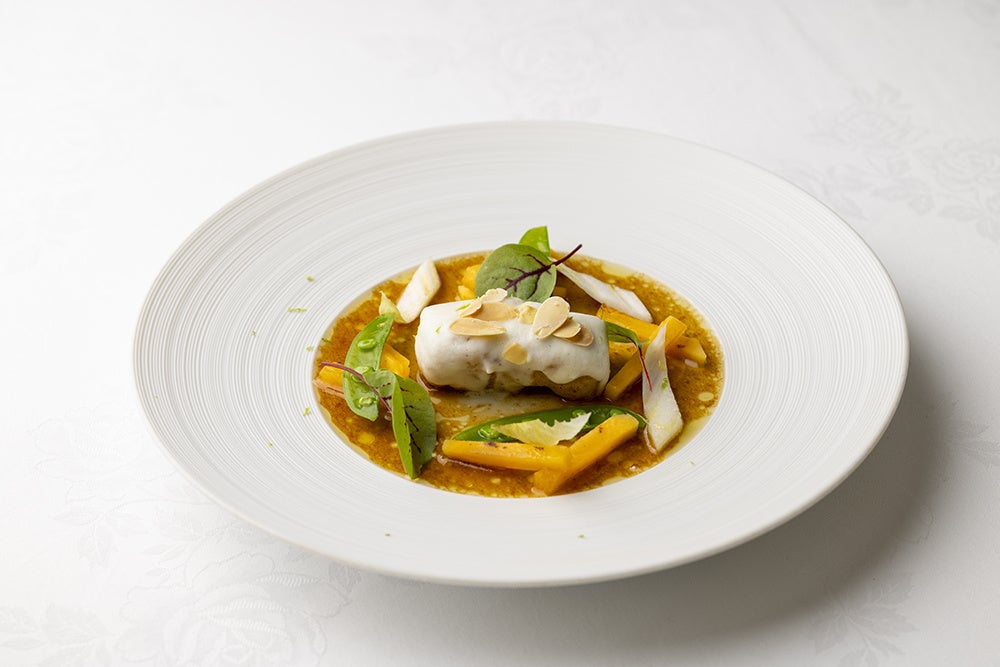 料理長・内木塲が「今季一番のおすすめ」と太鼓判を押す魚料理。平目のムニエルに、上品な甘味のカリフラワーのクレム(クリーム)をまとわせ、風味豊かなバターソースと合わせました。フレッシュな柿の食感と味わいがアクセントの一品。