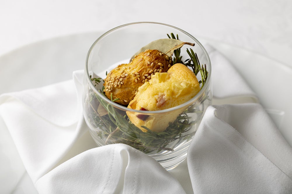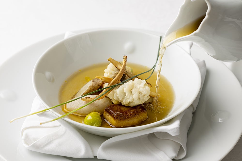 濃厚なフォアグラとクリスピーな鱧のフリットに、丁寧に取ったトリュフのコンソメが合わさり、芳醇な香りと旨味が口いっぱいに広がる一皿です。