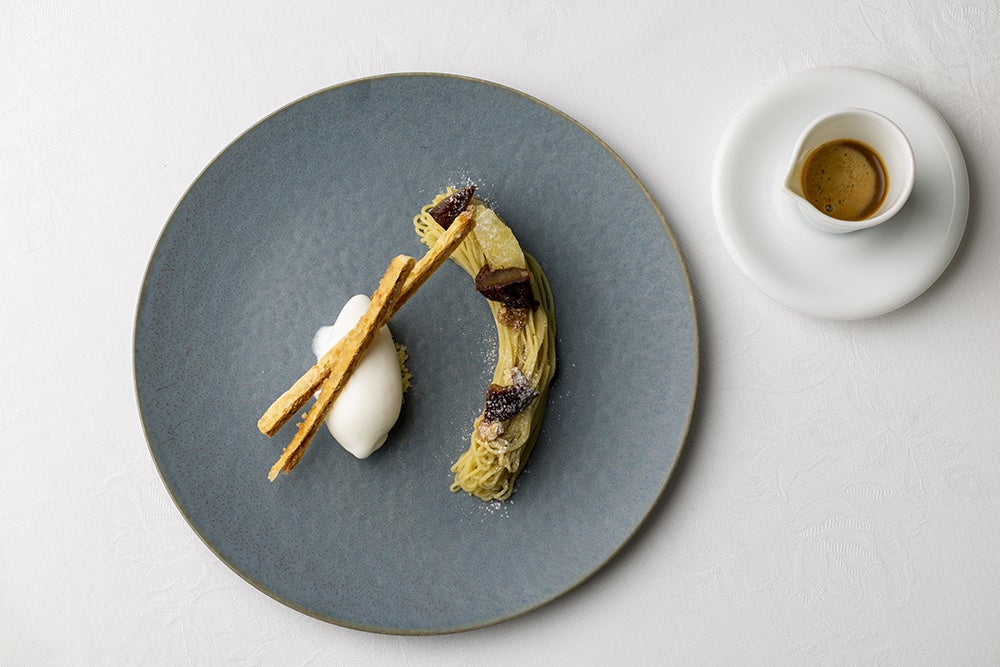 ほっくりとした食感と豊かな甘味が特徴の熊本産和栗をふんだんに使用したモンブランを、ヨーグルトソルベと塩キャラメルのソースで味わうデザート。モンブランに添えられたレモンのコンフィチュールがアクセント。