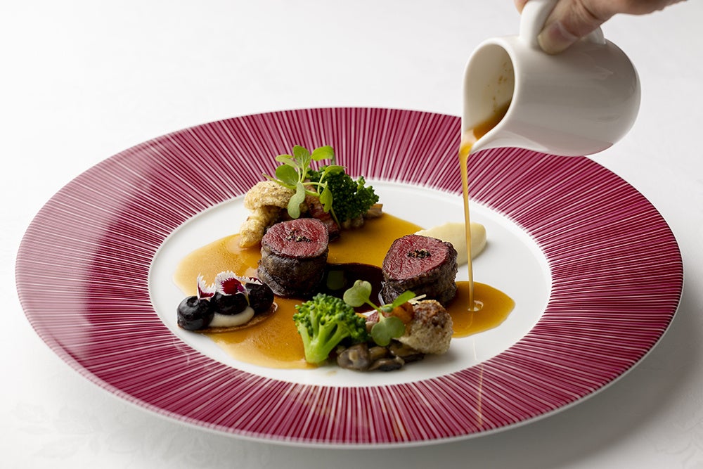 ジューソースを後がけして仕上げる鹿肉のメインディッシュは、赤ワインのレデュクションと一緒に味わう一皿。博多すぎ茸と旬の茸のフリカッセや、熊本県・山都町産の肉厚なブルーベリーのコンポートなど、それぞれの食材の味わいや食感の違いも楽しんでほしい。