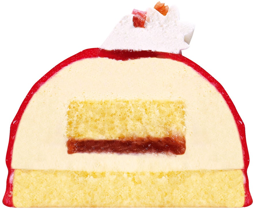 ピンク色のビスキュイ生地を巻いた可愛らしい苺のケーキ。スポンジに軽いタイプのカスタードクリームとプレミアムシャンテリークリームを重ね、中には苺ソースとダイスカット苺をしのばせました。上面はカーネーションに見立てた苺と苺ソースで仕上げ、カーネーションの造花を飾りました。