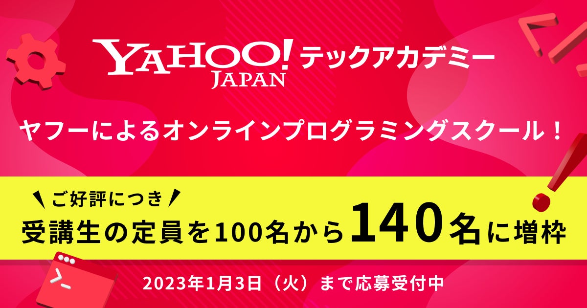 ヤフー株式会社(以下Yahoo! JAPAN)が提供する、プログラミング未経験者からエンジニアへのリスキリングを支援する「Yahoo!テックアカデミー」は本日、受講生の定員上限を100名から140名に増枠しました。