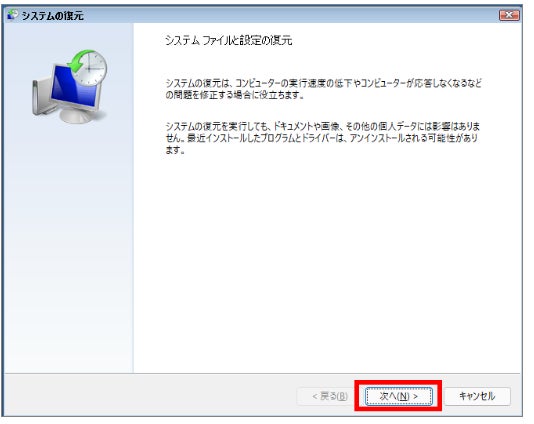 Step5:「システムファイルの設定と復元」が表示されたら「次へ」へ進み、復元ポイントを選択します。
