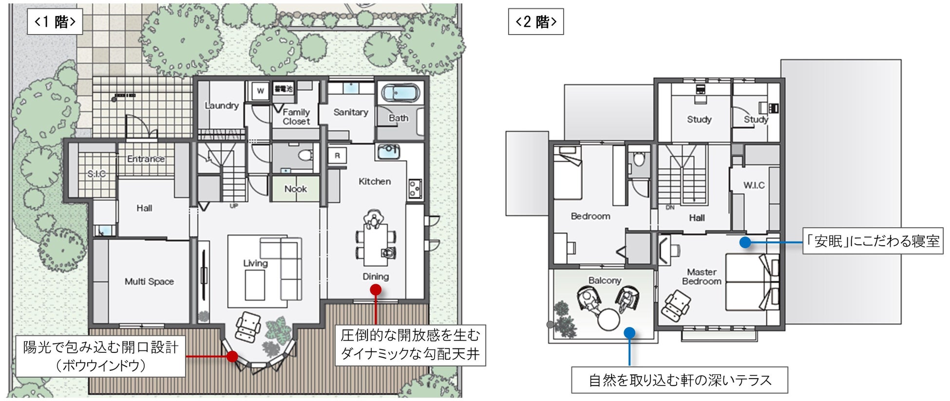 今回、新たに発売する『ザ・デザイナーズ グランツーユー』では、傾斜屋根の美しいシルエットと上質な内部空間を実現するデザイン&プランニング指針を策定。外観は、屋根形状と開口部のモールディングを活用し、クラシックな意匠を施したファサードデザインと、木質感のあるディテールの装飾性、タイル外壁の重厚感が普遍的な美しさを引き立てます。内部空間は、室内に入り込む光をコントロールし、景色を取り込むボウウインドウや傾斜屋根の深い軒を活かしたテラスなど、自然と調和するパッシブデザインを実現。これらの美しい工業化建築デザインを、家の大半を工場でつくることで実現する高強度で高品質な構造体を有する独自の木質ユニット工法で支えます。