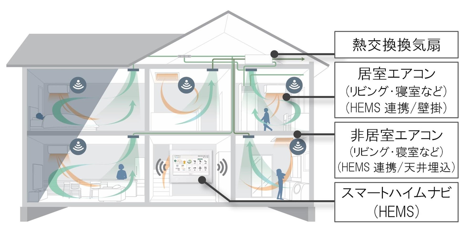 今回、新たに家全体の個別エアコンをエネルギー管理システム(HEMS)「スマートハイムナビ」で集中コントロールし、家じゅう(※4)快適な温度環境を実現する独自の第一種換気・全室空調「グラン・エアシステム」を開発。本システムでは、各室及び非居室のエアコンを連携し事前に設定を行うことで、お手持ちのスマートフォン(※5) 1台で簡単に家全体※4の各空調制御が可能になります。