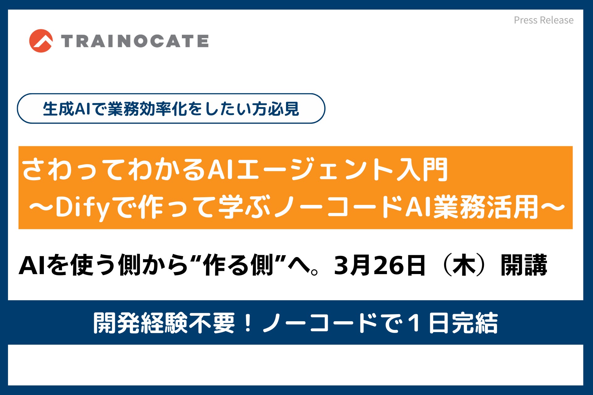 トレノケート株式会社(本社:東京都新宿区、代表取締役社長:早津 昌夫)は、生成AIとノーコードツールを活用したAIエージェント構築を1日で実践的に学べる新しい研修「さわってわかるAIエージェント入門~Difyで作って学ぶノーコードAI業務活用~」を、2026年3月26日(木)より提供開始いたします。