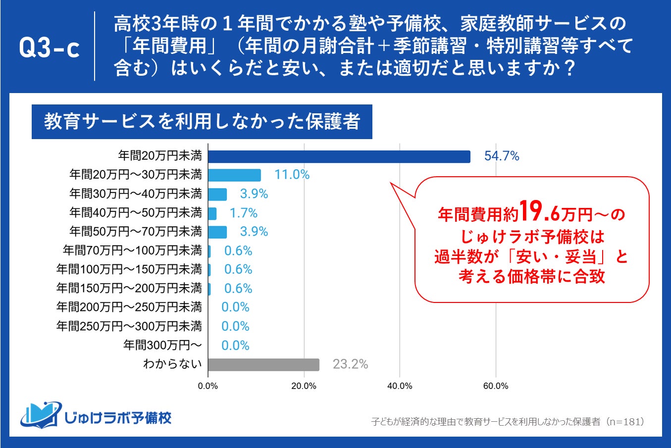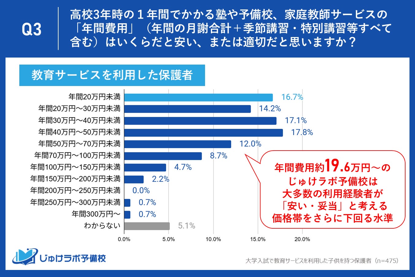 じゅけラボ予備校(所在地:大阪市北区、代表取締役:後藤智則)は、大学受験対策で教育サービス(塾・予備校・オンラインサービス含む)を利用した経験のある保護者475名と、「費用面での負担」を理由に利用しなかった保護者181名を対象に、「じゅけラボ予備校」の費用(月謝16,280円~、季節講習費なし)に関する意識調査を実施しました。