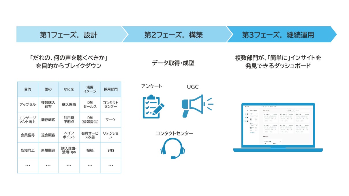 まず、VOCを「どんな部分に活用したいか」など、具体的に目的を設計し、その目的を達成するためには「だれの何の声を聞くべきか」を整理します。さらに、企業の様々な部門及び場所に散在している膨大なVOCデータを集約し、データの成型、分析、活用のための示唆出しまで行い、VOCから得られた 顧客理解を基に設計した施策を継続的に実行し、ロイヤル顧客拡大につなげていきます。