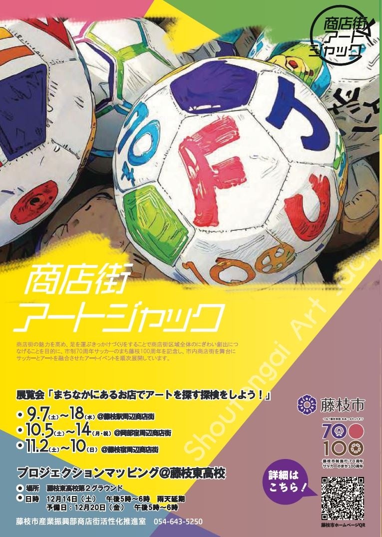 内 容:藤枝順心高校美術専攻の生徒の皆さんや白子100円笑店街ワークショップで子どもたちが制作したサッカーボールアートや、市内外で活躍するアーティストの作品を商店街店舗などに展示します。
