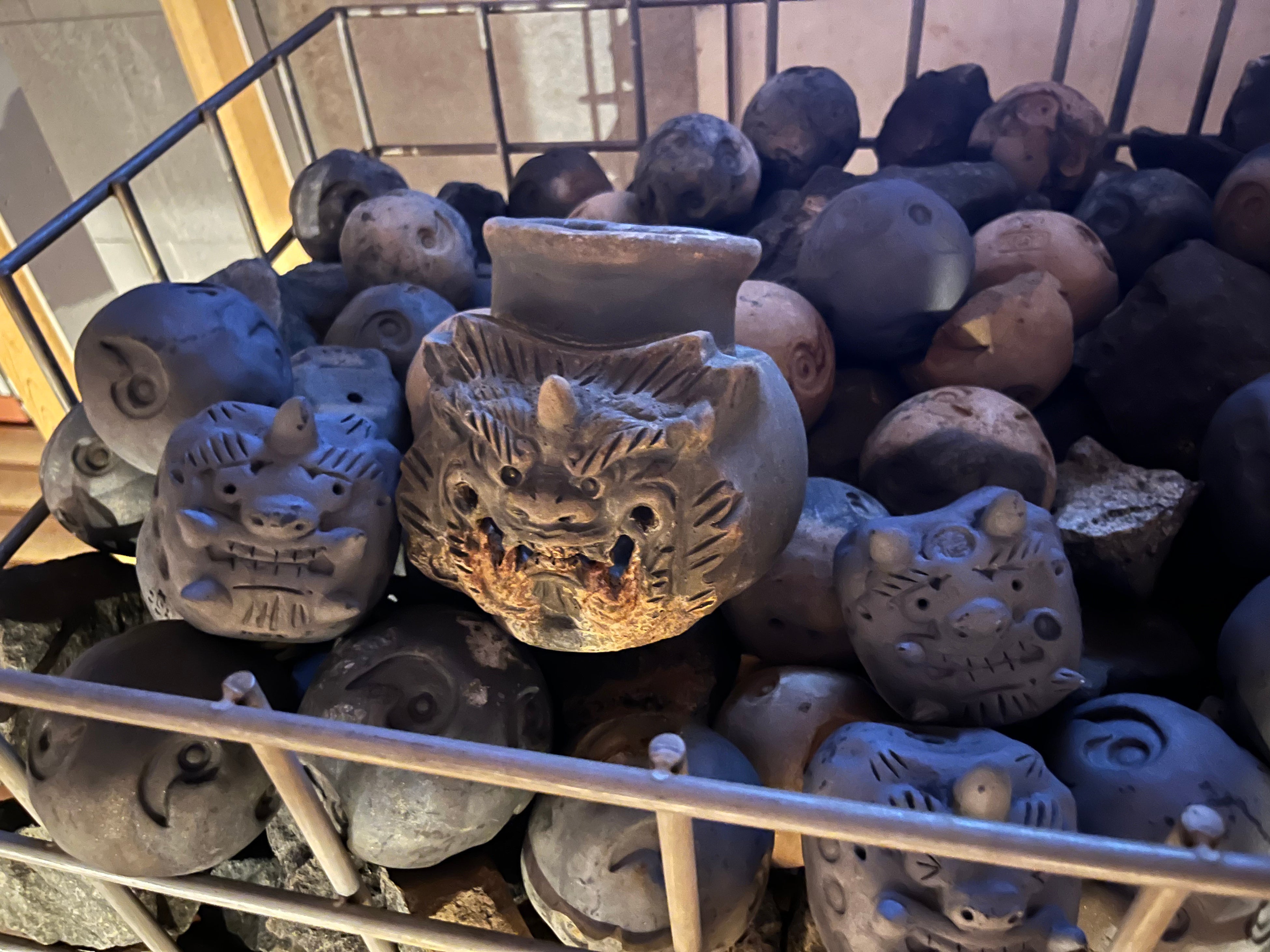 ▲菊間瓦製サウナストーンの、鬼瓦デザインの「鬼丸」と勾玉模様の「鬼玉」