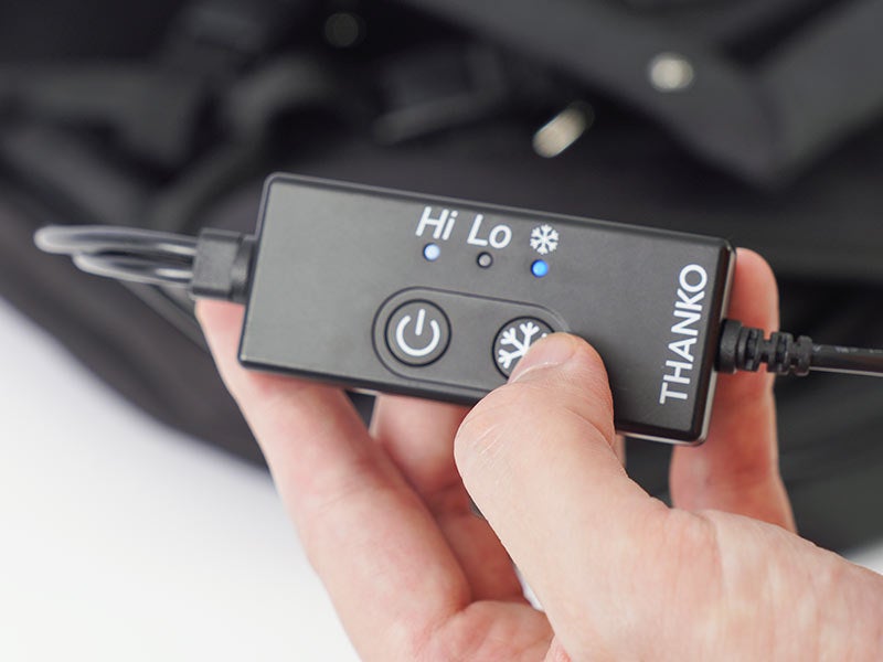 電源を入れると外気温から最大-19度に冷えたペルチェ式冷却プレートが背中を冷やします。さらにファンを搭載し、背中に風を送ります。