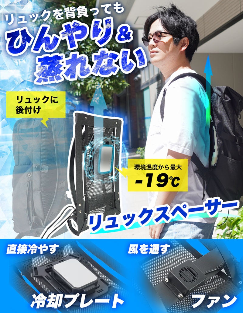 本製品はお手持ちのリュックサックに取り付けて使うペルチェ冷却&風で冷たいウェアラブルクーラーです。
