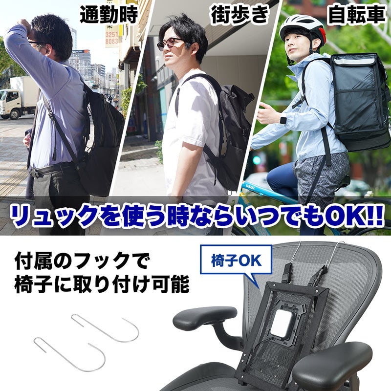 リュックサック以外にもイスに取り付けての使用、車のシートに置いて使うこともできます。