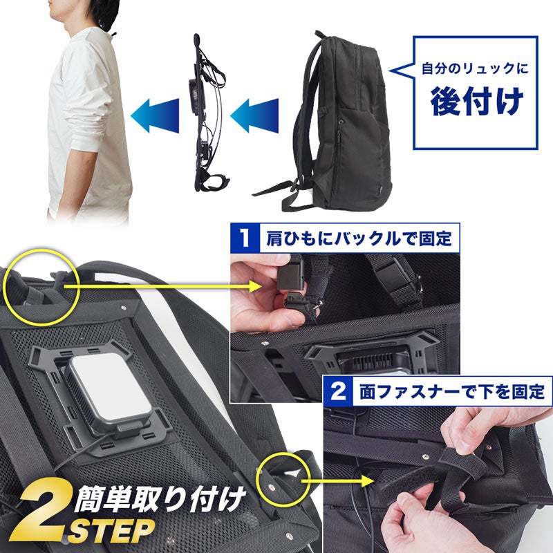 取り付けはリュックの左右の肩ベルトに上部2か所のバックルと下部2か所の面ファスナーを止めるだけ。様々な形状のリュックサックに取り付けが可能です。