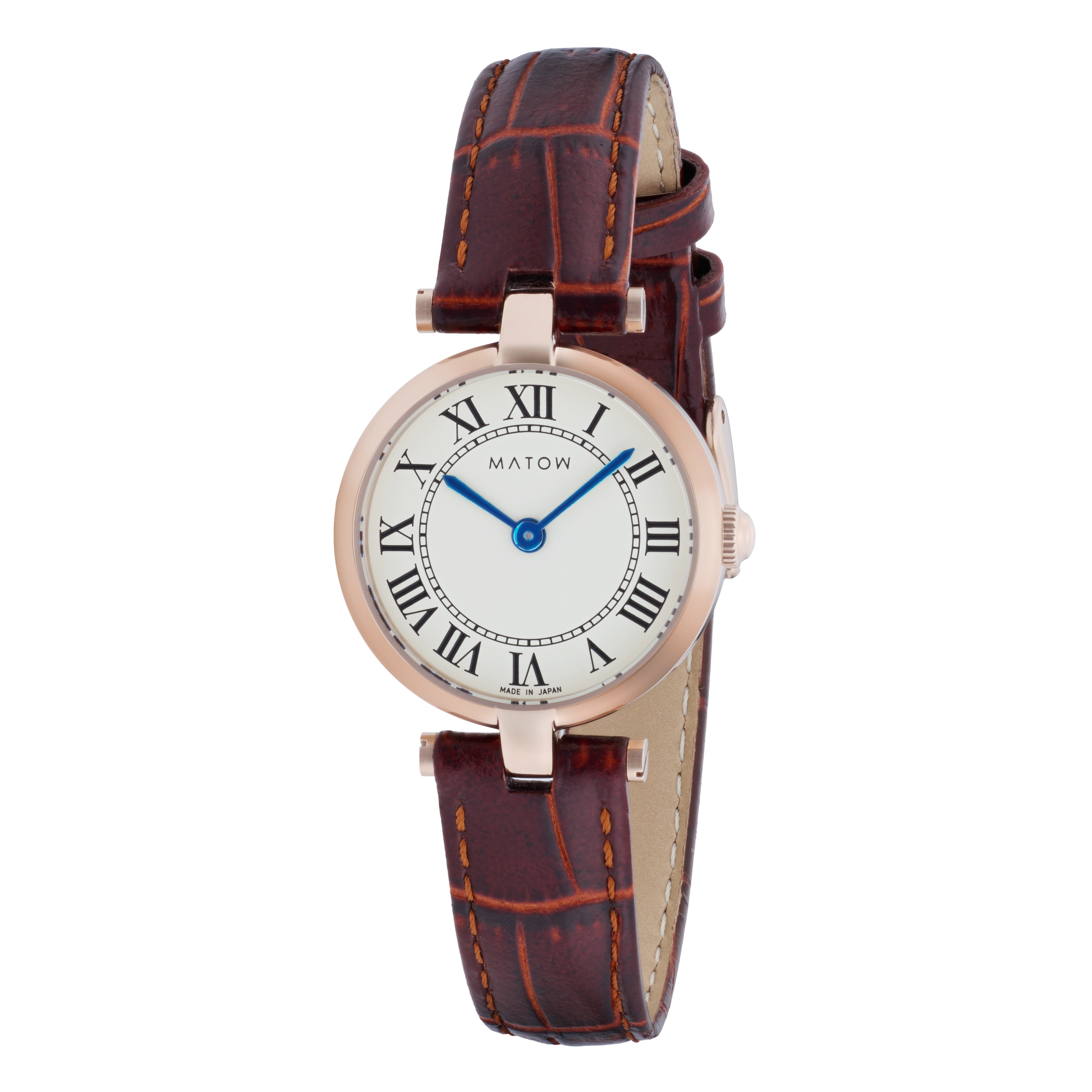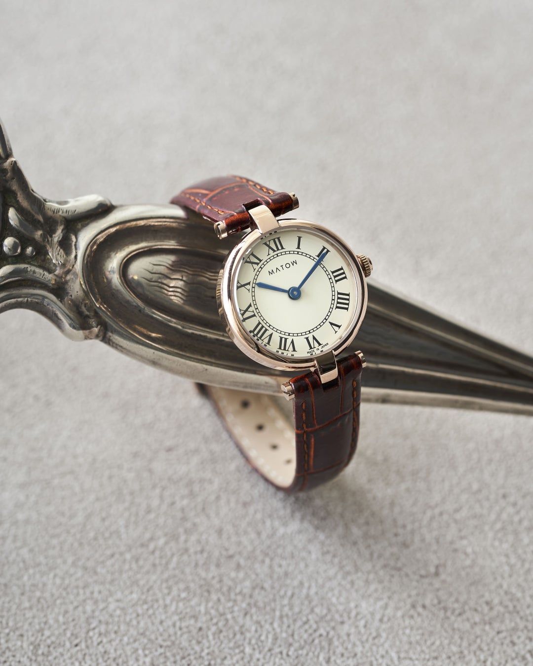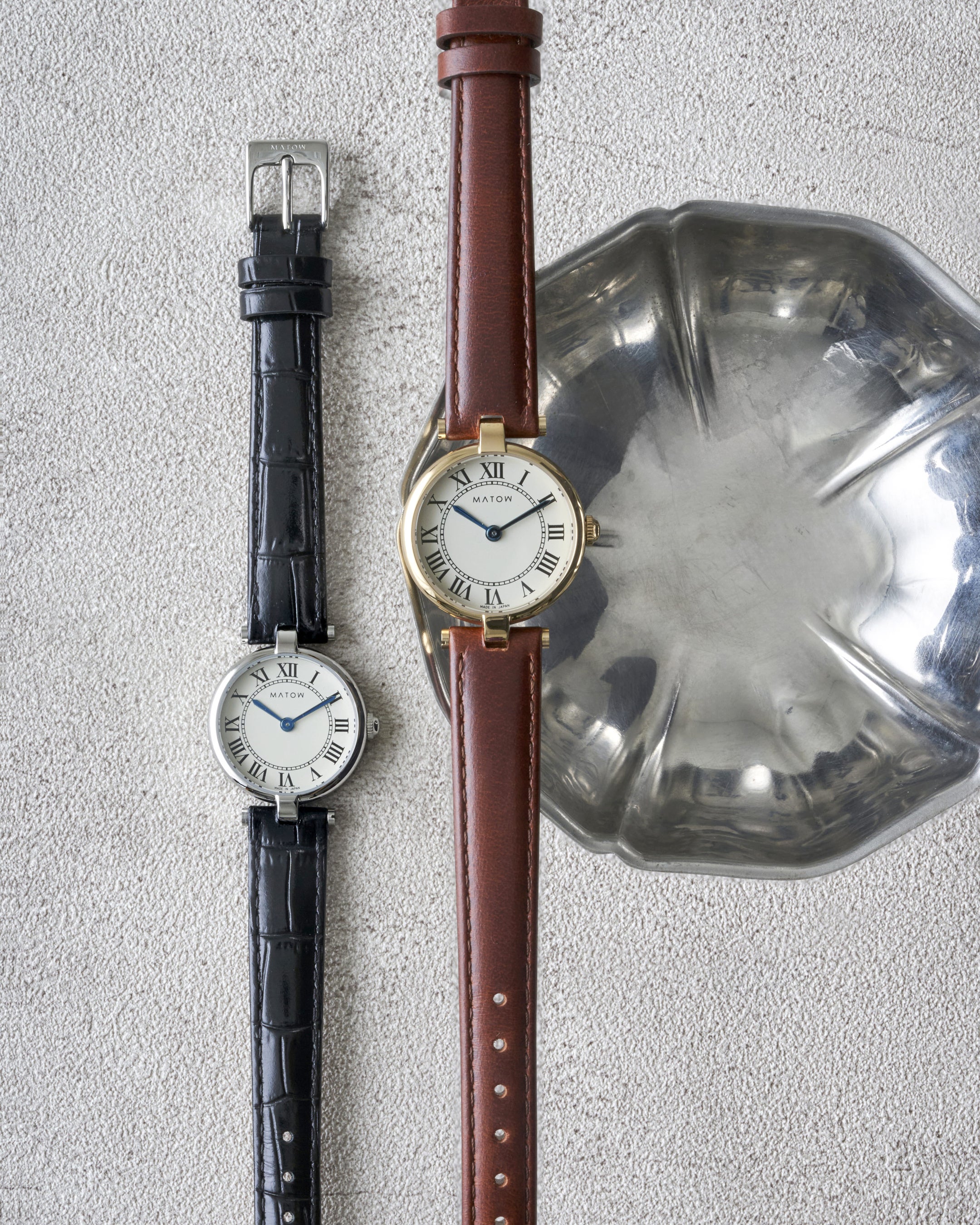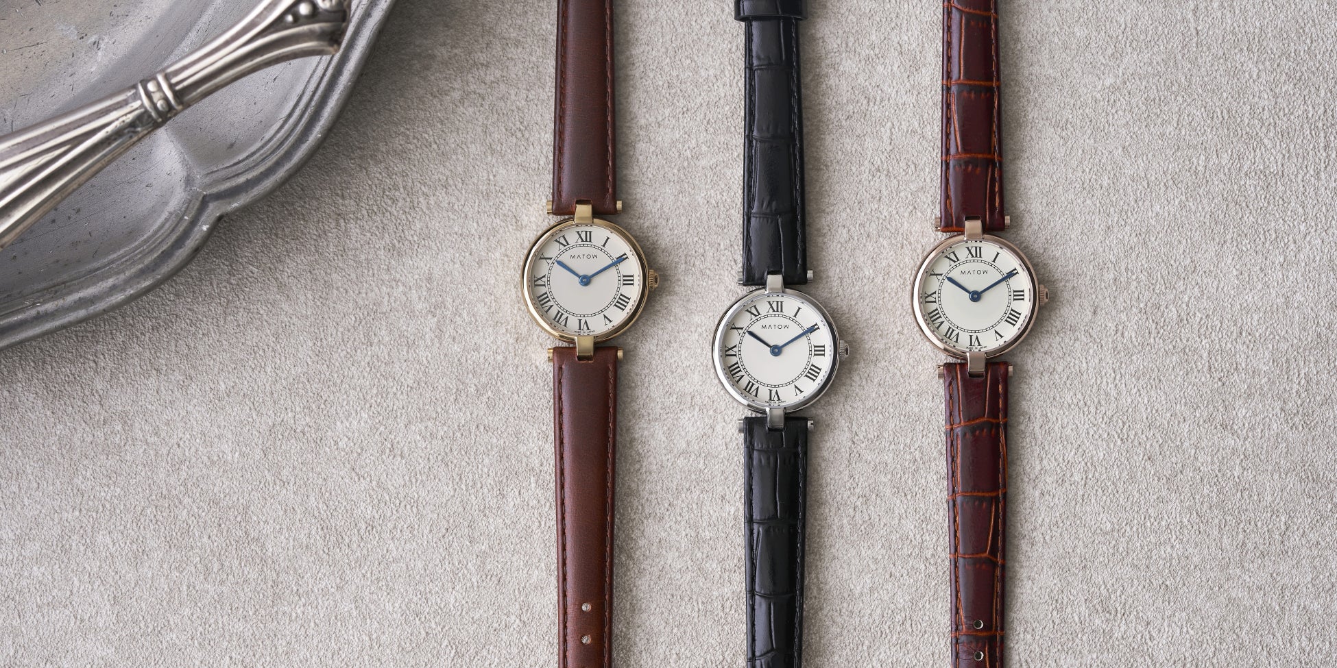「Aura(アウラ)」は、時を重ねることで生まれる気配や、装いに自然と溶け込む存在感から着想を得たコレクション。端正なラウンドケースに、クラシカルなローマ数字の文字盤、そしてやわらかな表情を持つレザーストラップを組み合わせ、手元に静かな品格をもたらします。過度な装飾を施さず、光の当たり方や所作によって印象が変わるデザインは、身に着ける人それぞれの雰囲気をそっと引き立てるもの。MATOWが5年間大切にしてきた「時間を慈しむ」という価値観を、よりシンプルで本質的なかたちへと昇華したコレクションです。本コレクションでは、定番モデルに加え、グレーレザーストラップを採用した1型をTiCTAC限定モデルとして展開。落ち着いたグレーのニュアンスが、Auraの持つ静かな世界観をより一層引き立てる、特別な1本となっています。