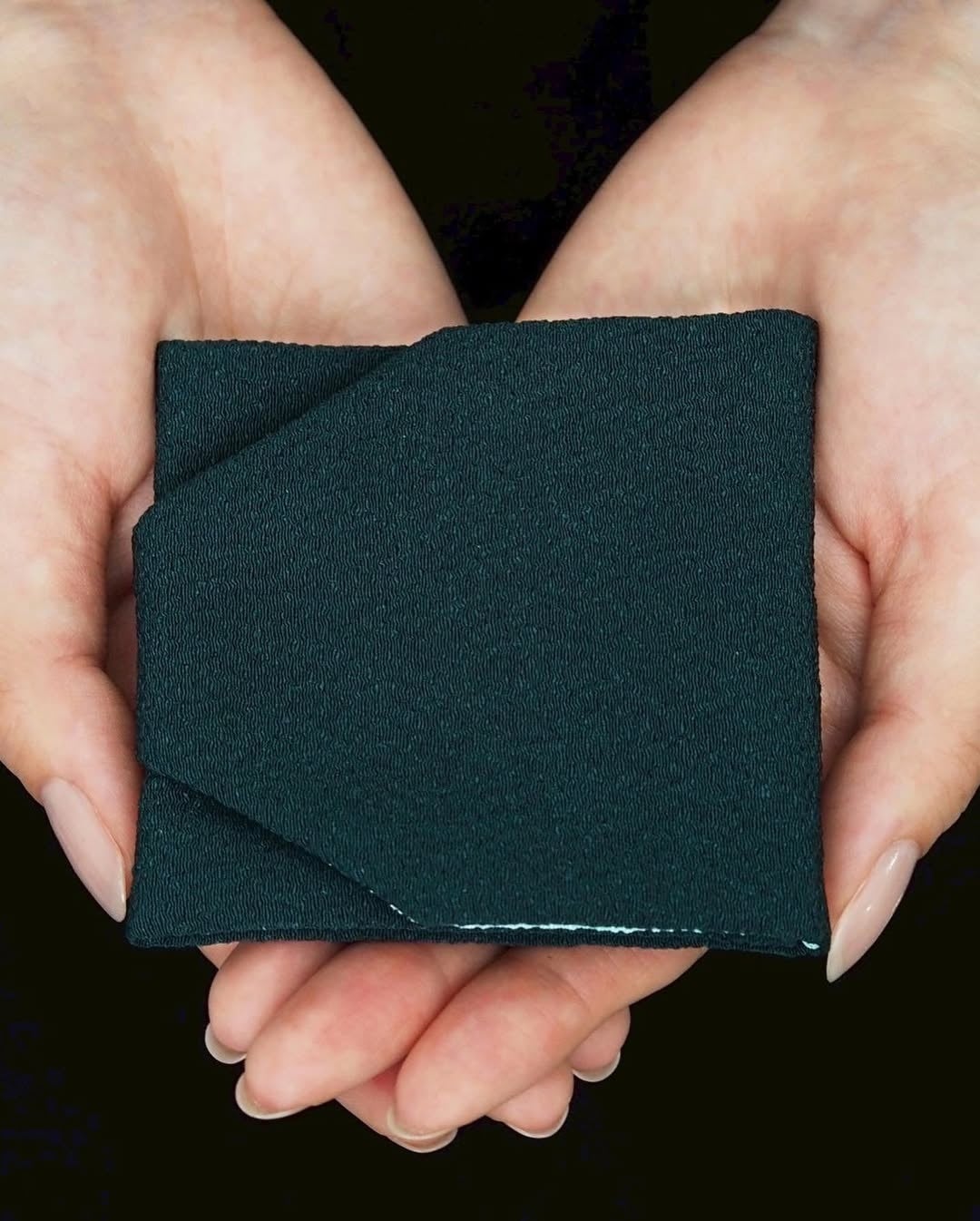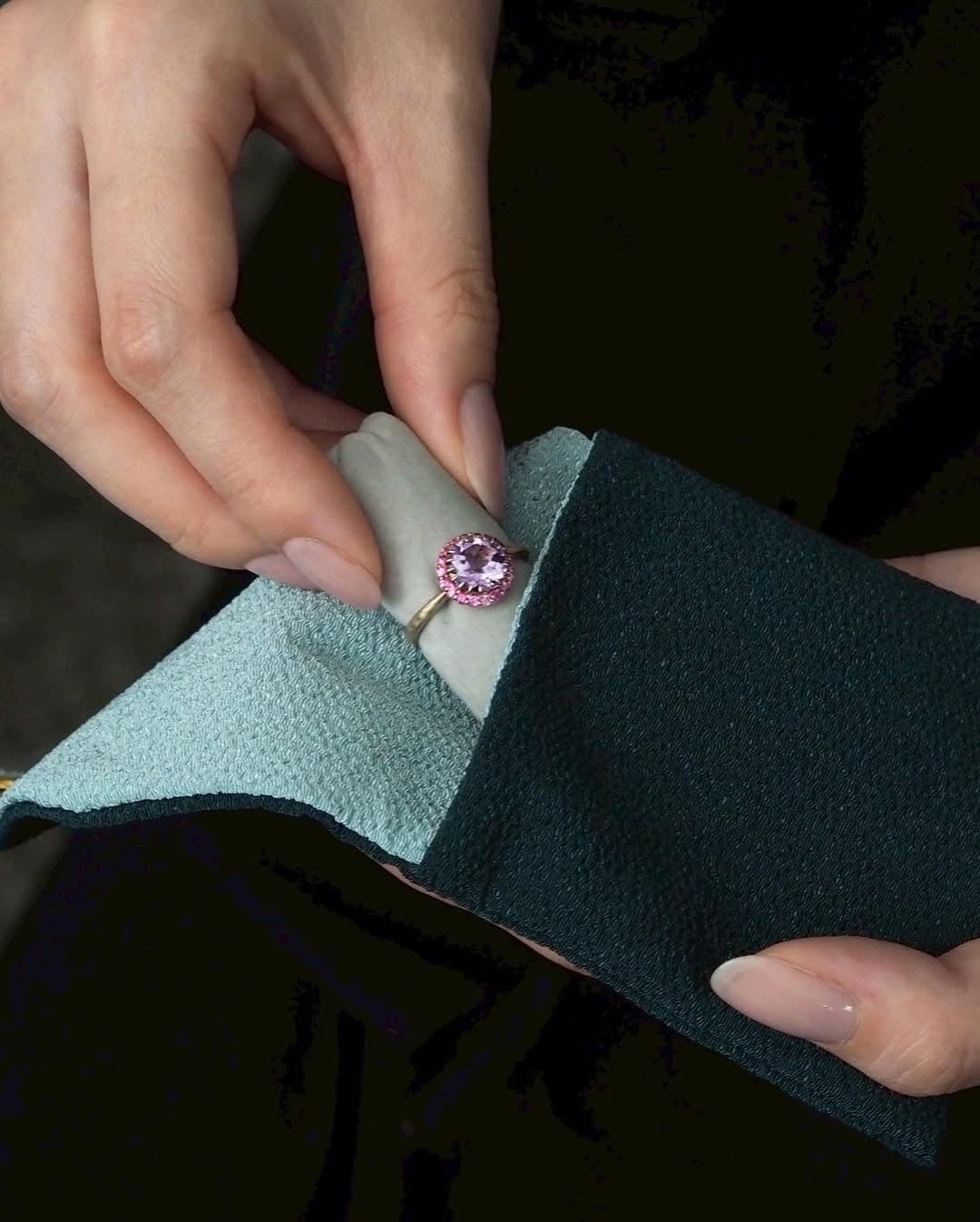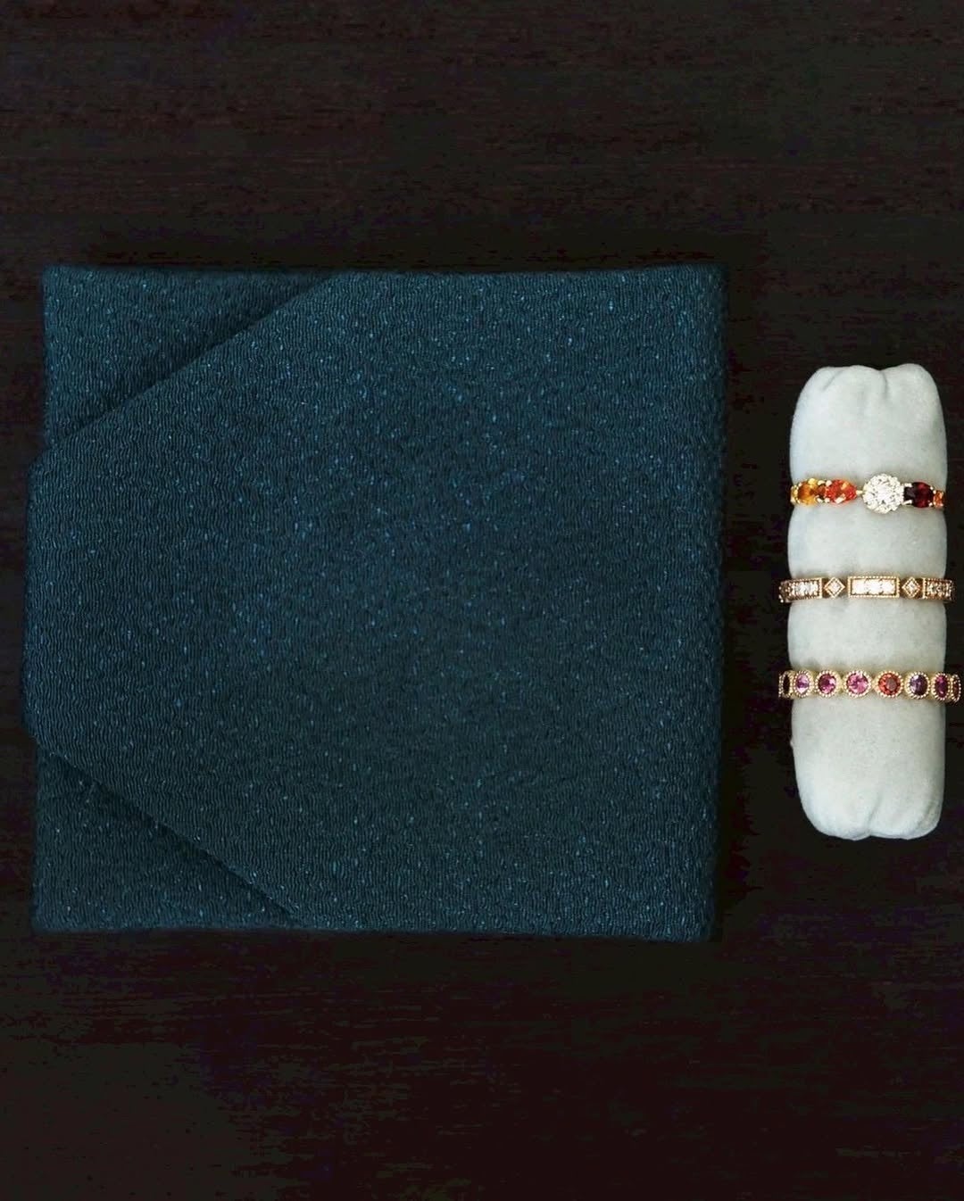 今回お渡しするジュエリーポーチは、パーセル ジュエリーのロゴにもなっている“平包み”をモチーフにしたデザイン。内側にはリング用の仕切りも付いており、持ち歩きにも便利なつくりです。