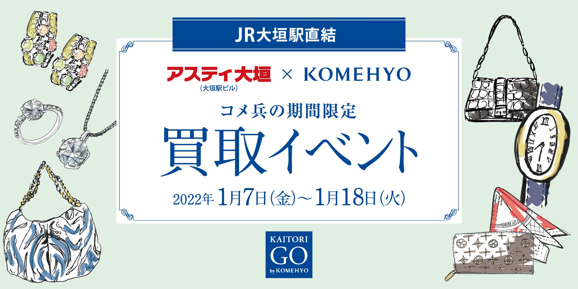 「世の中の良質を永遠につなげていく」をミッションとするリレーユースカンパニー※1 コメ兵(以下「KOMEHYO」)は、岐阜県大垣市にあるアスティ大垣にて、2022年1月7日(金)~18日(火)での期間限定で、買取イベント「KAITORI GO」を開催いたします。