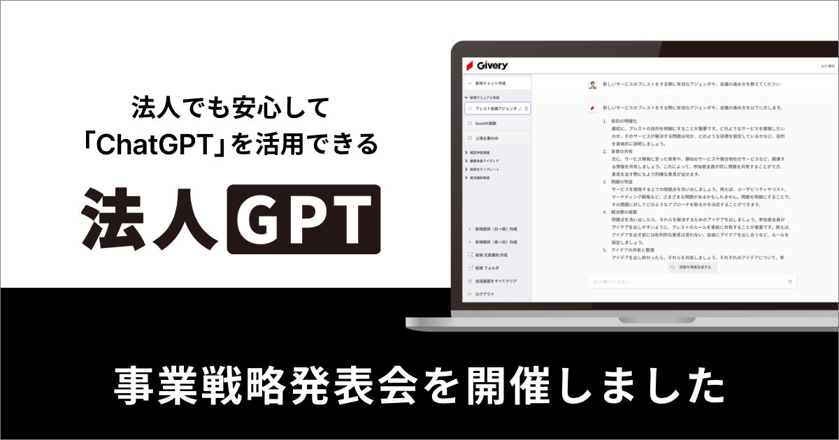 ギブリー、ChatGPT法人向けプラットフォーム「法人GPT」サービス提供開始に伴う事業戦略発表会を開催