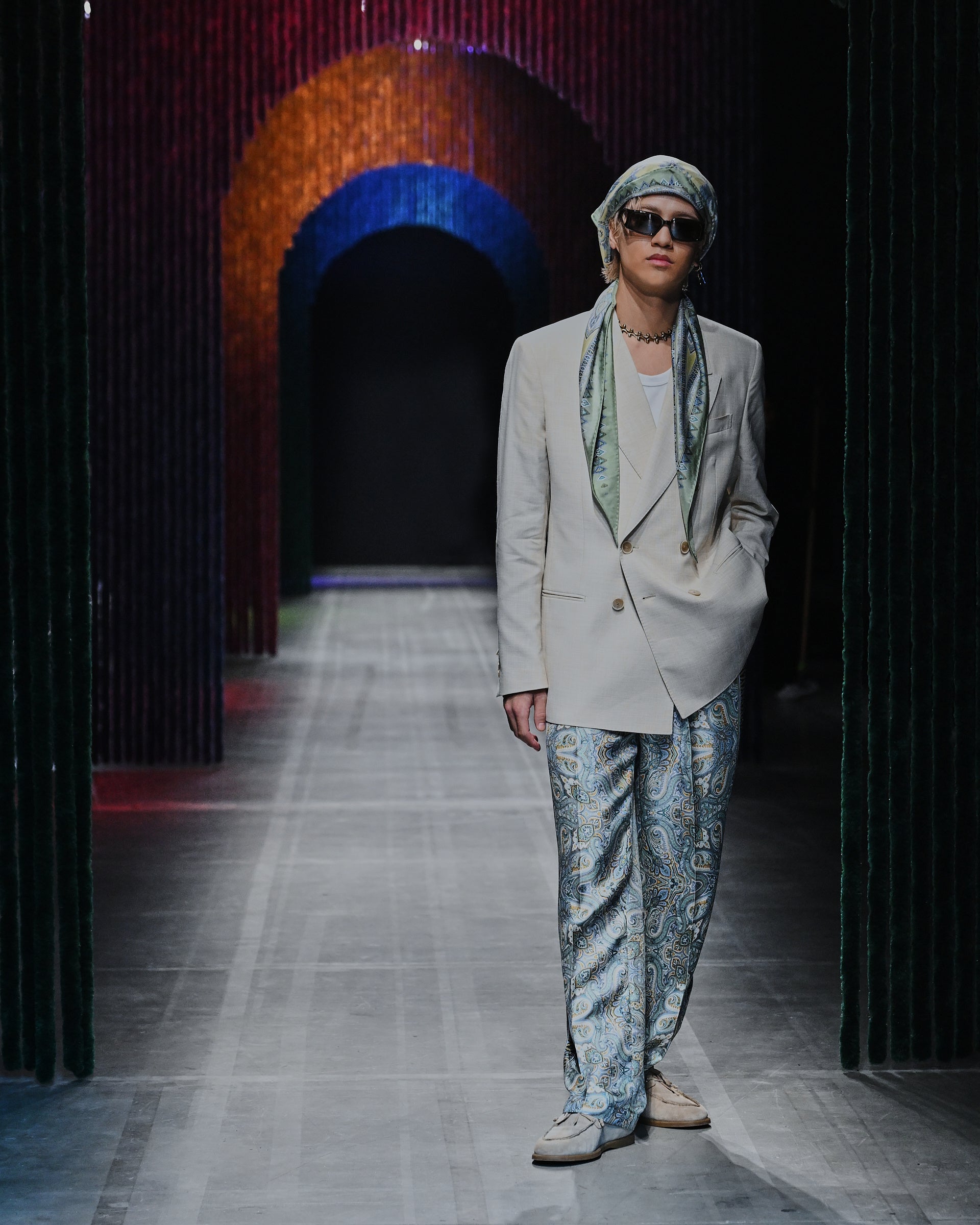 今回で4回目の参加となる髙橋は、エトロ2026春夏メンズコレクションより、上品で洗練されたライトベージュのダブルブレストジャケットに、シグネチャーのペイズリーをあしらった涼やかなライトブルーのシルクパジャマパンツを合わせたスタイリングをセレクト。同素材のスカーフをヘッドアクセサリーとして取り入れ、ペイズリーモチーフを象ったテンプルがアイコニックなアイウェアを合わせました。