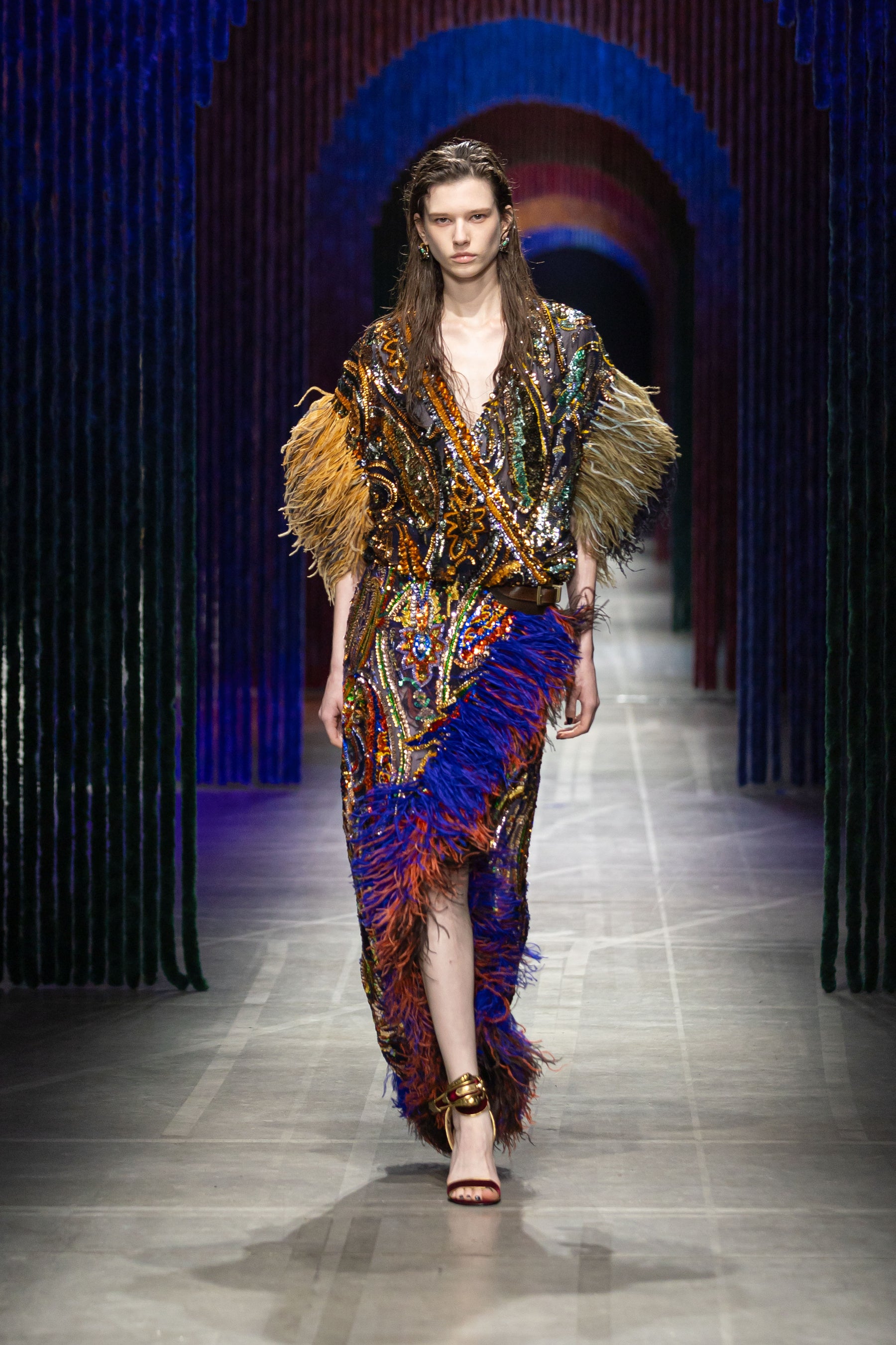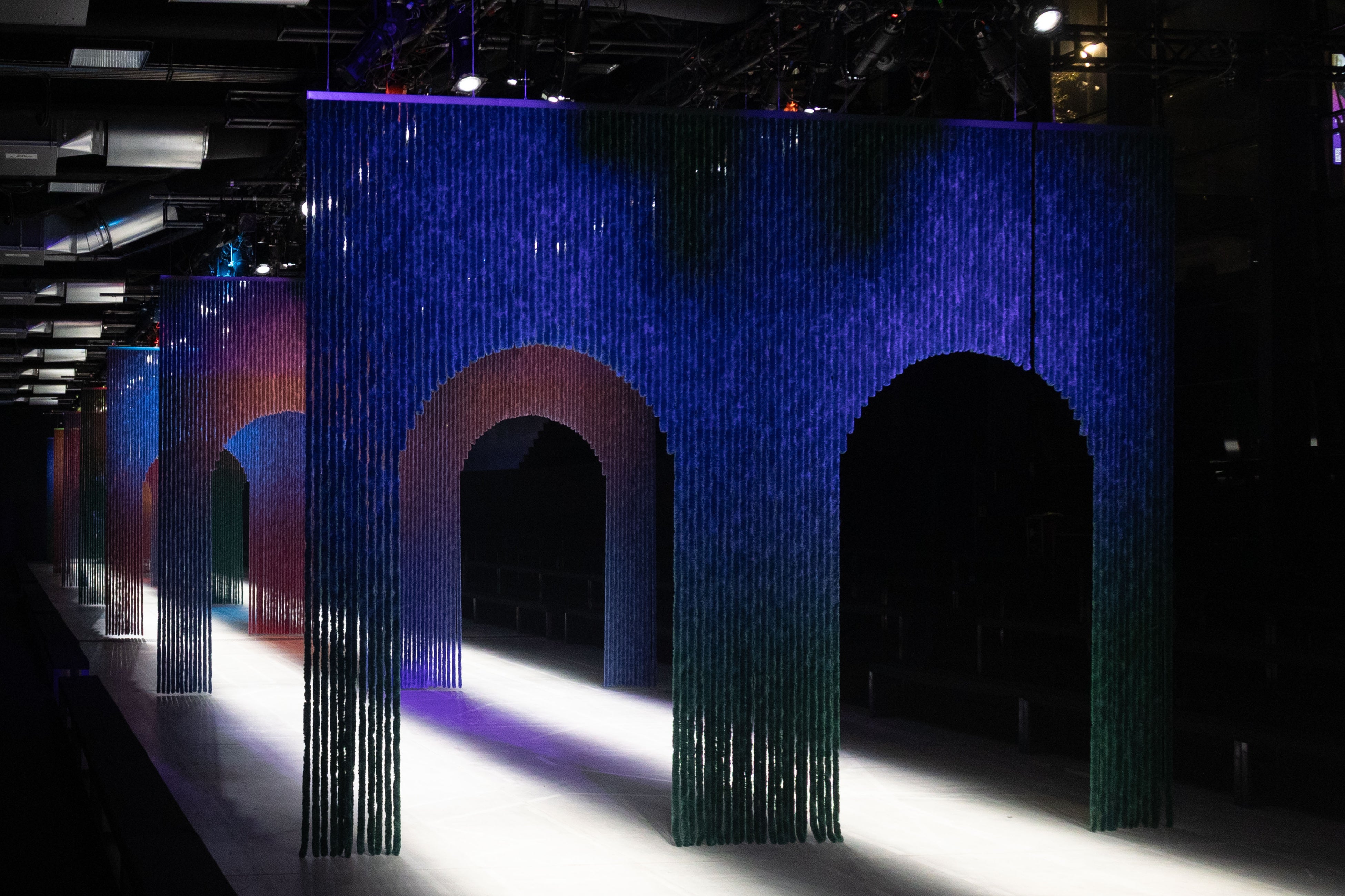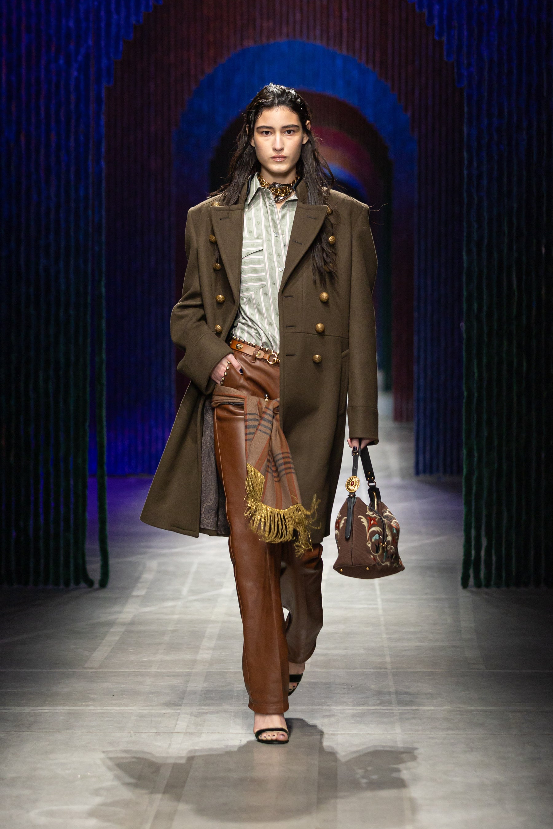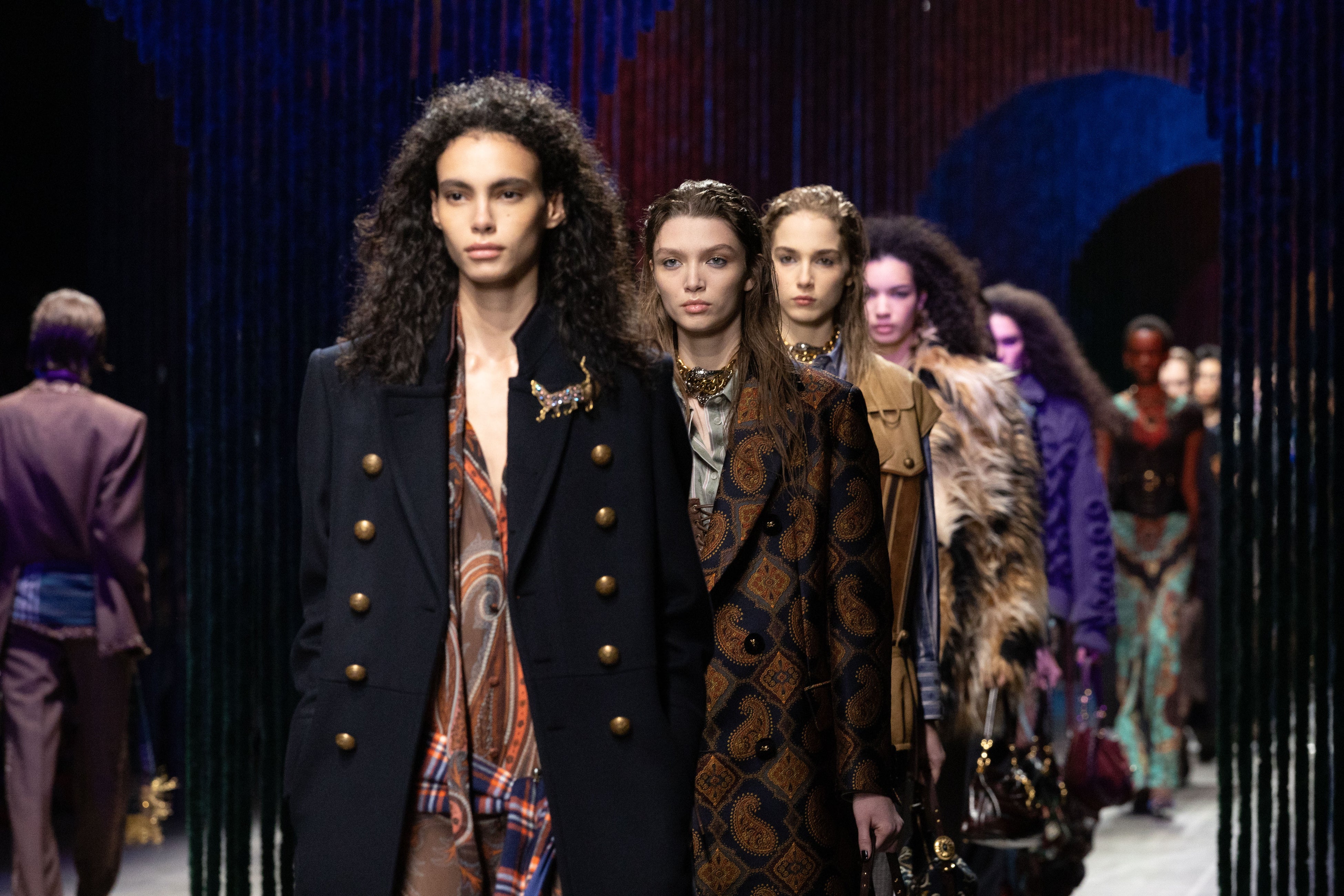 エトロの物語が進化を続け、人々を新たな世界へ誘うかのように、7つのゲートが設置された2026/2027秋冬コレクションのショーセット。そこに、幾重にも歌声を重ねたような「ブルーム」による神秘的かつリズミカルな音楽が響き渡り、ショー全体に繊細な余韻を深く刻みます。