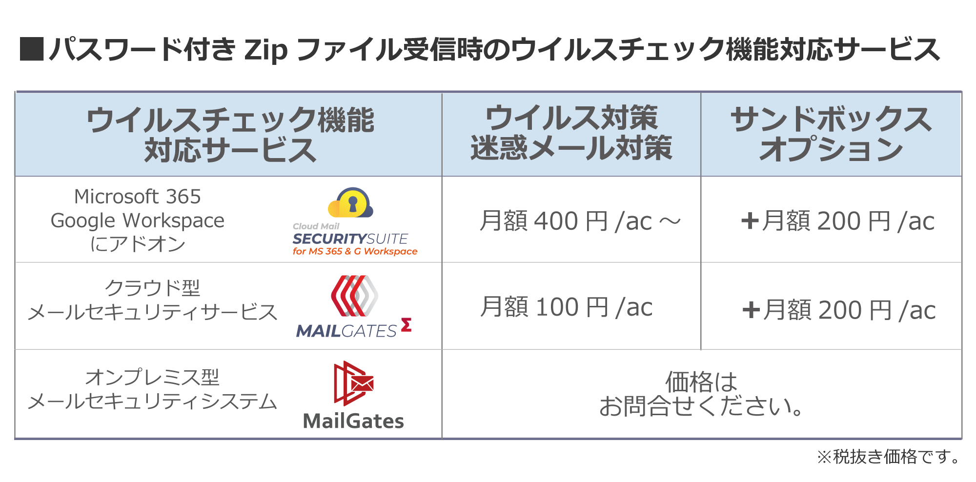 当社が提供しているクラウドメールセキュリティサービスは、メール受信時に、パスワード付きZipファイルをクラウド上で分離して保管、パスワードを入力して解凍し、ウイルスチェックを行い安全が確認できた後にダウンロード可能です。当サービスは、当社のクラウドメールセキュリティサービスの一部プランにおいて標準仕様として提供しています。月額100円(税抜)/アカウントから利用可能となっており、外部からの攻撃リスク対策を安価で実施できる料金プランとなっております。また、ご使用中のMicrosoft 365やGoogle Workspaceなどにアドオンして利用することも可能なため、メールシステムをリプレイスすることなく、低コストで導入することが可能となっております。