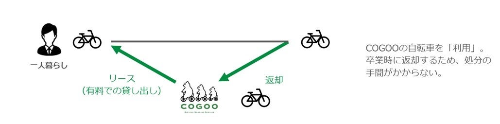 自転車必須層(主に一人暮らし)にリースで自転車を提供し、「所有」から「シェア利用」への移行を実現します。