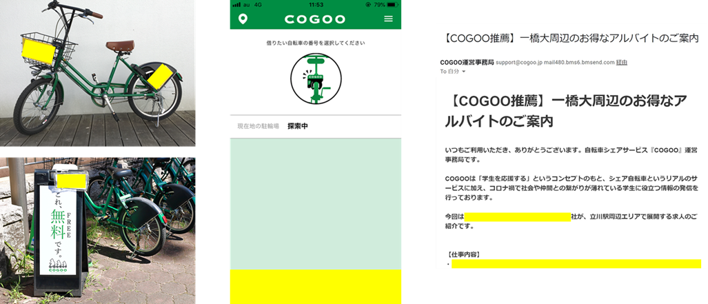 当社は、大阪大学、千葉大学、一橋大学のキャンパス内シェアサイクル『COGOO(コグー)』を運営する学生と共に、主に卒業生が放置していく自転車をシェアサイクルに転用する取り組みを開始いたしました。