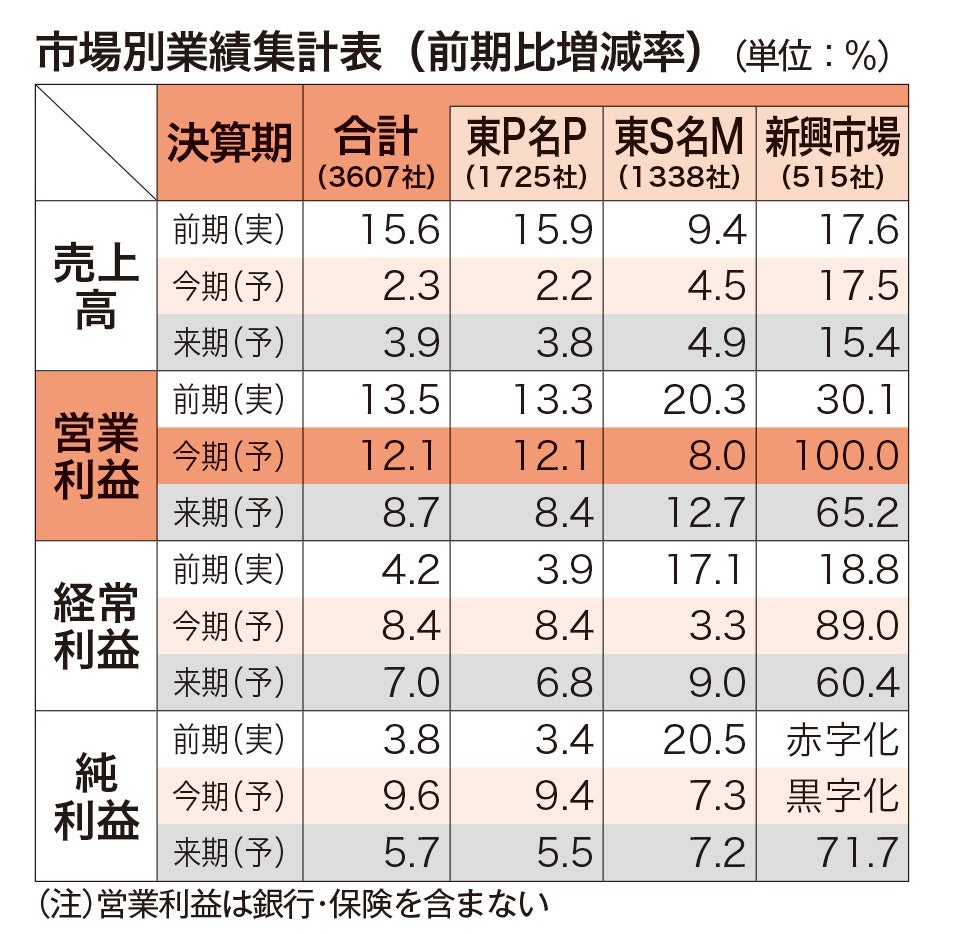 一方で、海運業は高騰していた運賃の下落で33.3%減の大幅な減益見通し。石炭や金属の資源相場も一服し、非鉄金属は19.2%減益、総合商社を含む卸売業が11.5%減益の予想です。