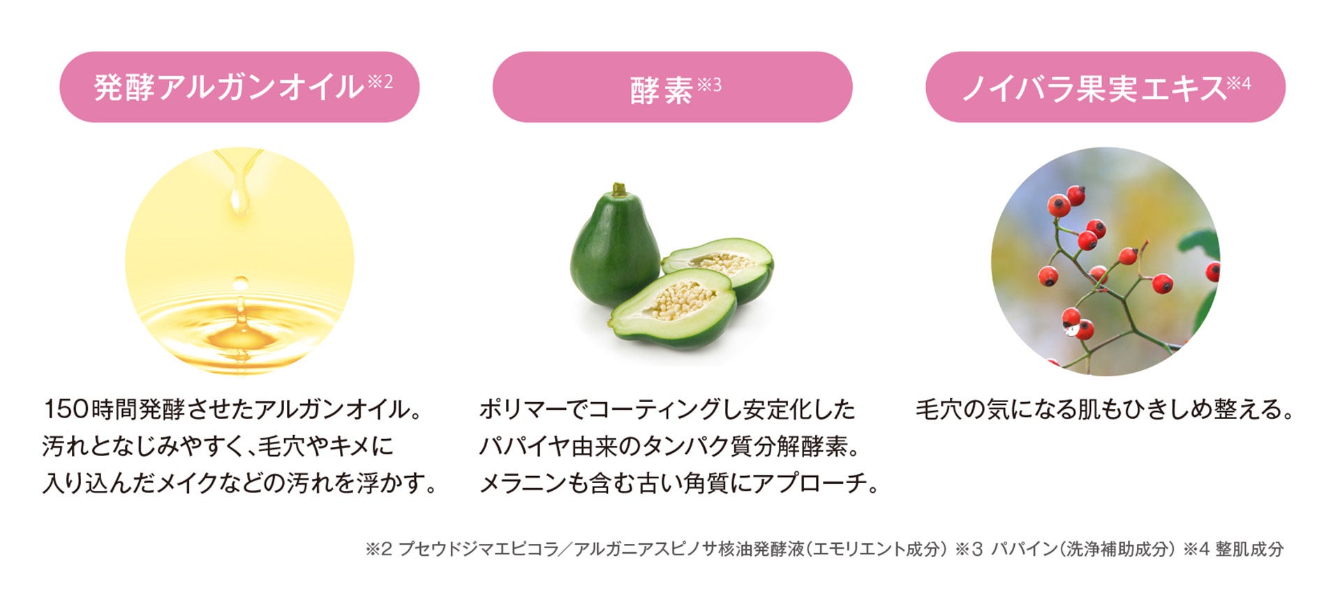 美容成分として、発酵アルガンオイル※1や異性化糖※2、吸着型ヒアルロン酸※3を配合したオイルジェルタイプのクレンジングです。弾力のあるジェル状が、エステティシャンのような摩擦レスなタッチでメイク汚れに密着。その後、オイル状、ミルク状※4へと変化し、メイク汚れをしっかり落としながらも、しっとりなめらかな肌に洗い上げます。